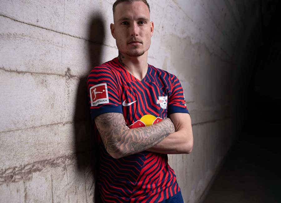 The 2023-24 primary-change release for the Red Bull-owned German Bundesliga side features busy graphical embellishment in navy blue and red and more than a hint of the idiosyncratically quartered look of a can of the energy drink.