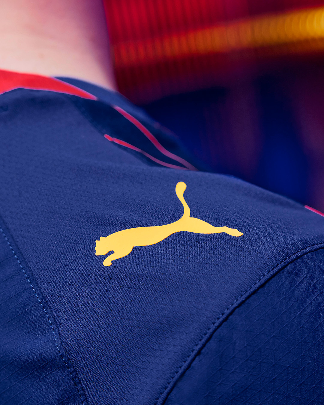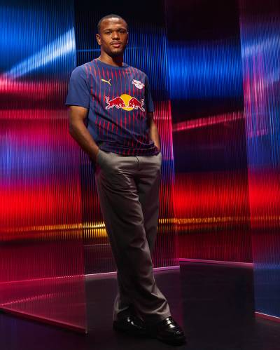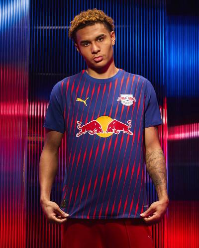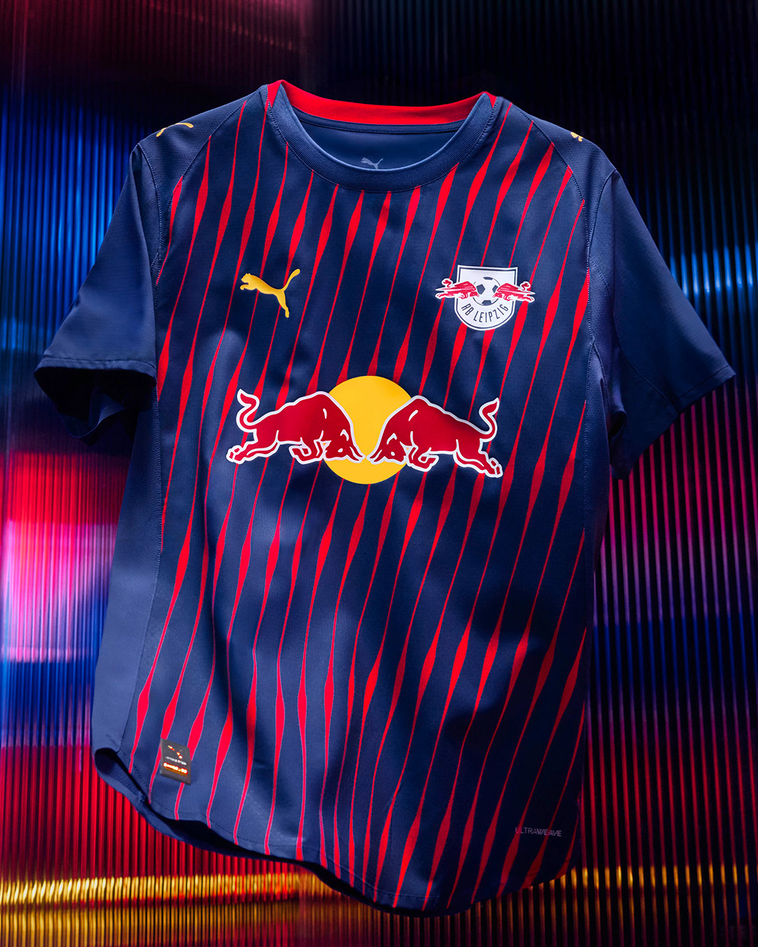 RB Leipzig have released their 2025–26 away kit by Puma, featuring a navy blue base with dynamic red diagonal pinstripes that create a kinetic visual effect, inspired by the red LED strips found inside the Red Bull Arena.