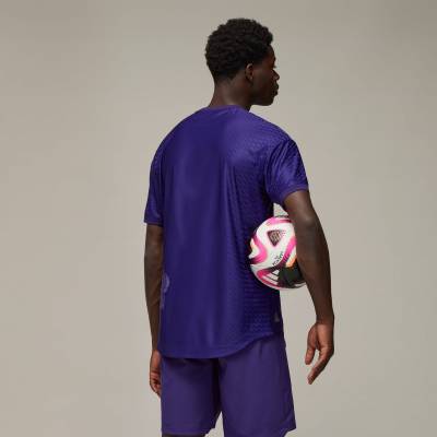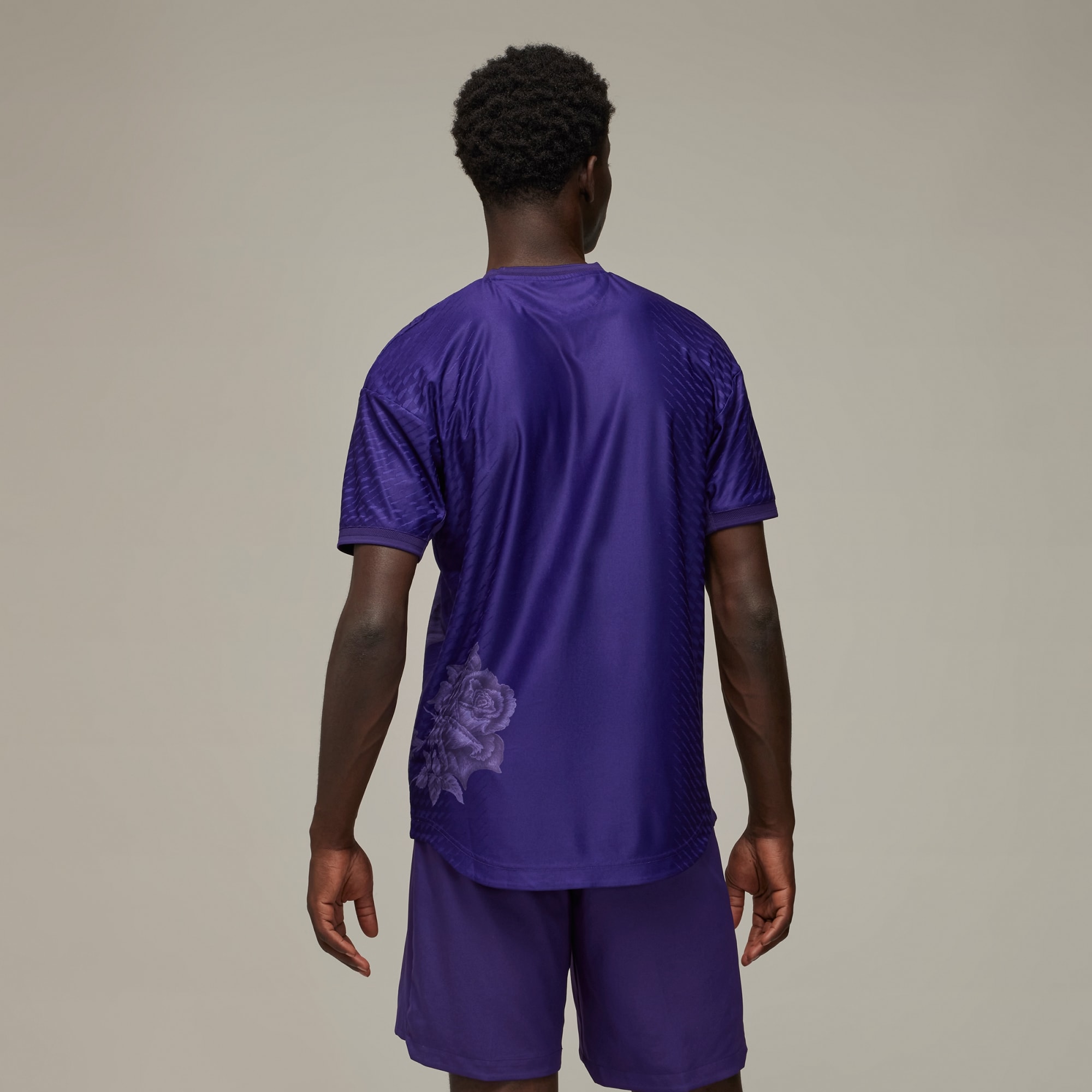 Featuring a Dark Purple shirt with a bold floral design, the kit showcases heat-applied Y-3 logo and Yohji Yamamoto's signature.