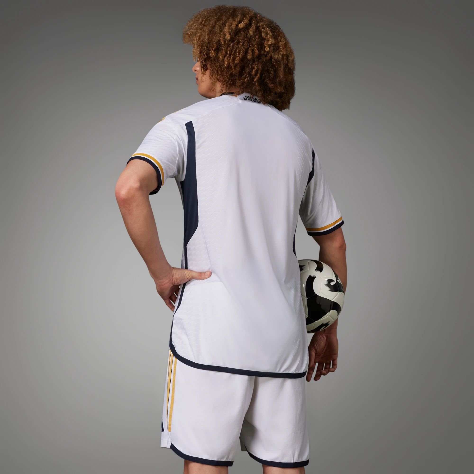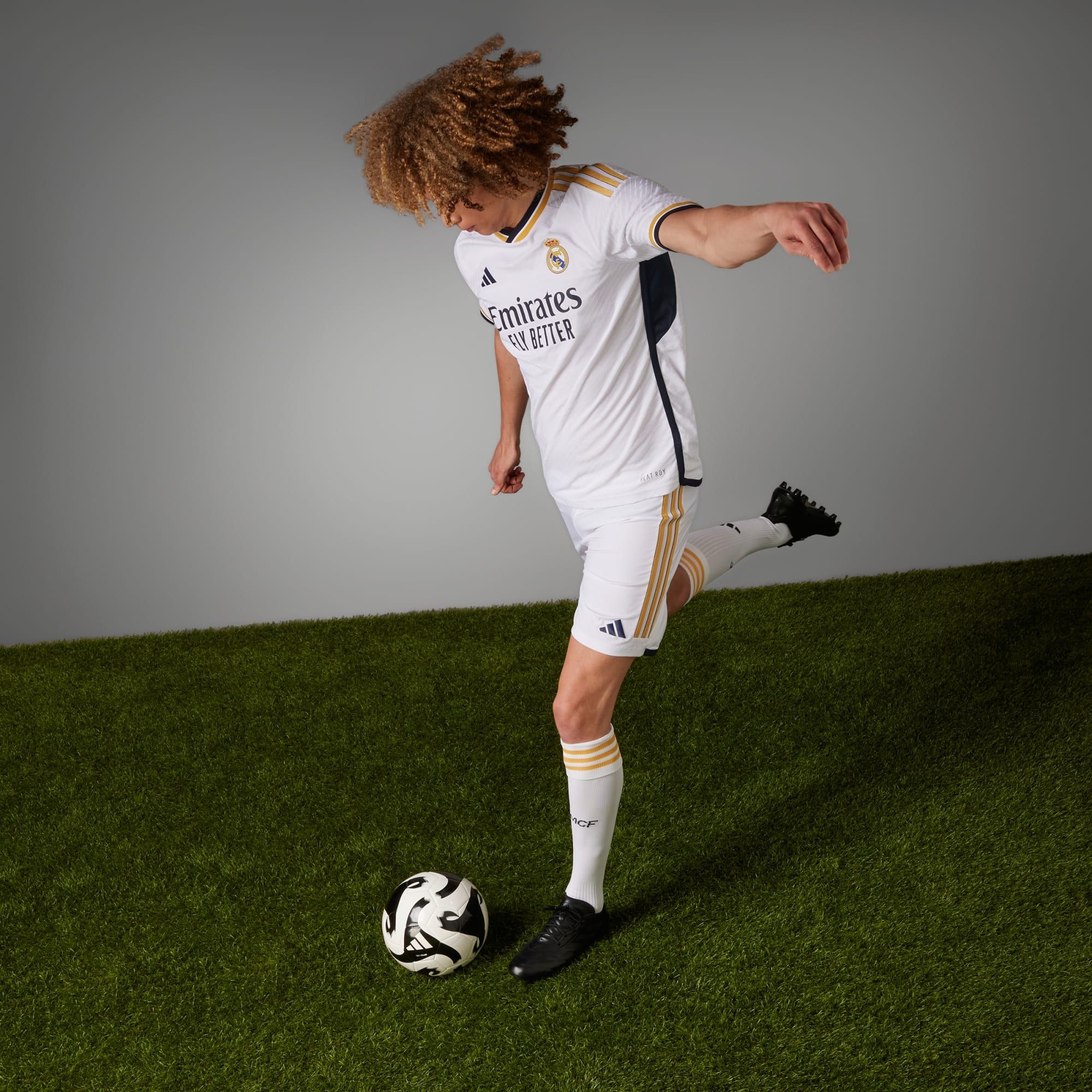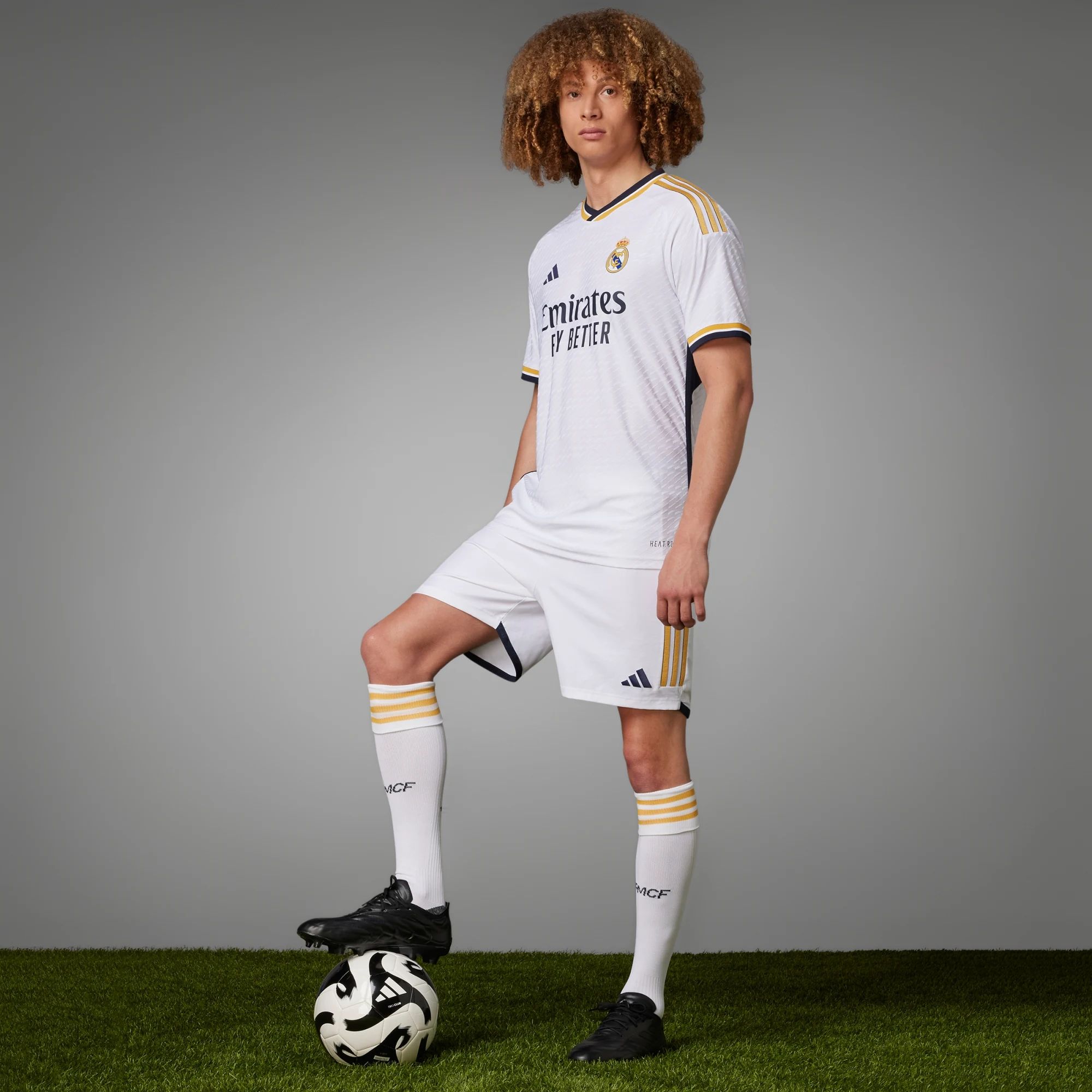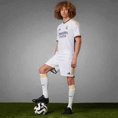 With a nod to older kits, the iconic white jersey is enhanced by gold adidas stripes on the shoulders, while navy blue and gold accents adorn the v-neck and sleeves.