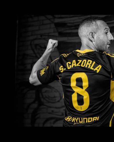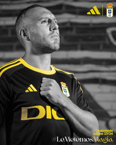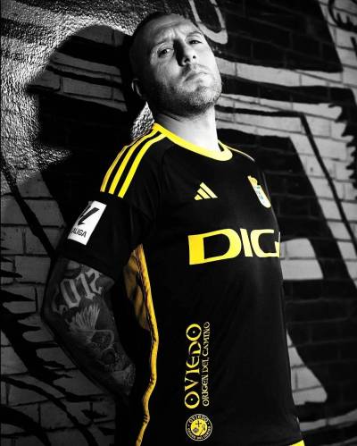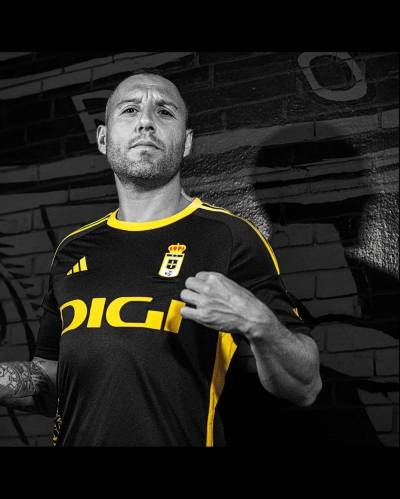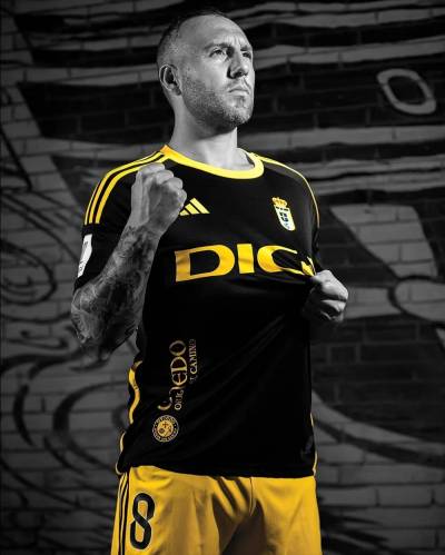 That means partner branding and the vertically aligned “OVIEDO [-] ORIGEN DEL CAMINO” is in yellow, with the kit completed with yellow shorts and complementing socks.