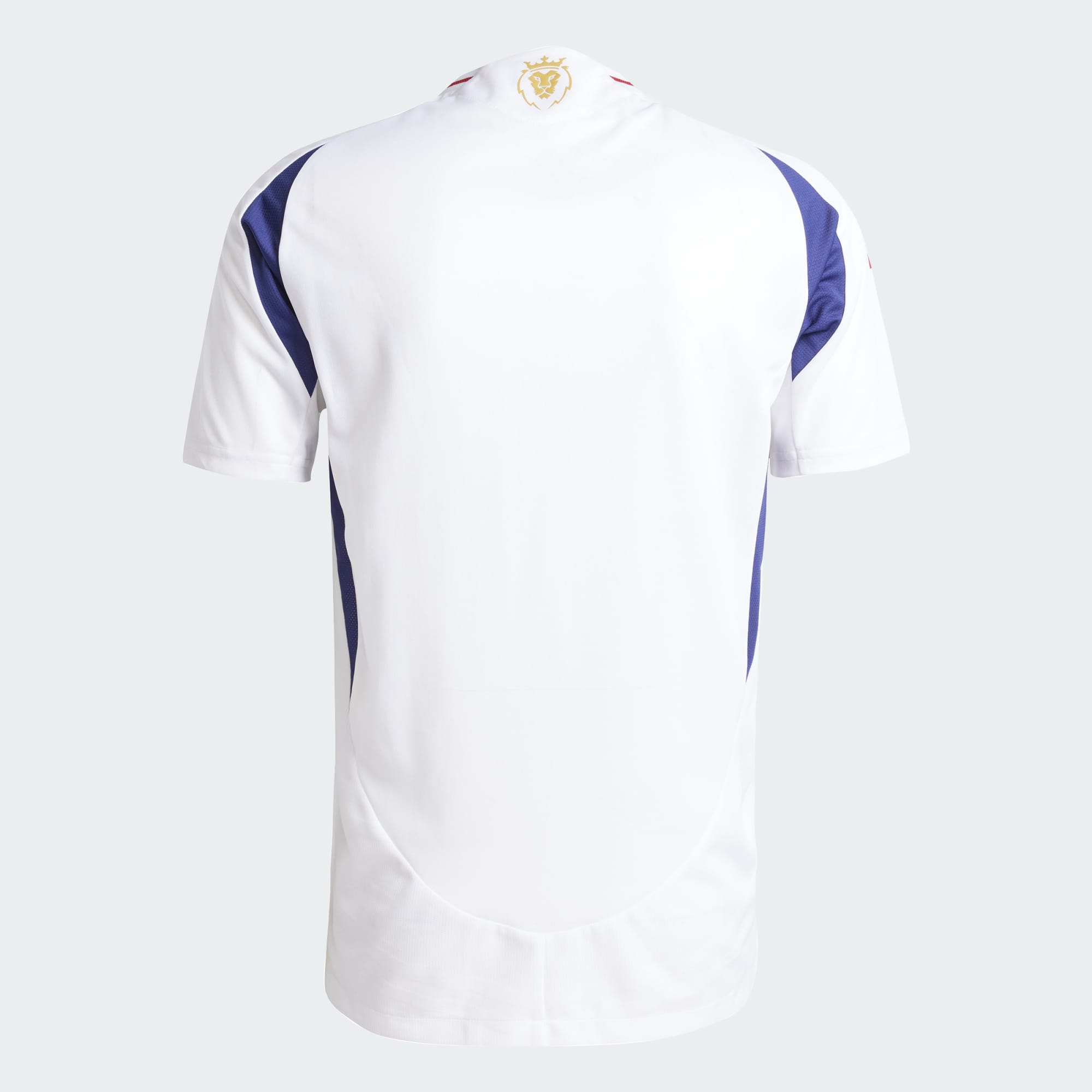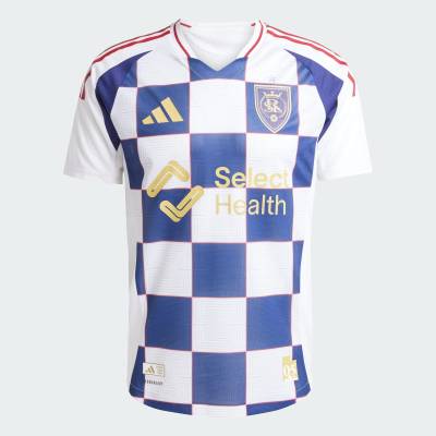 The club crest, adidas logo, and sponsor branding appear in gold, contrasting with the blue-and-white checkered base. Red adidas Three-Stripes run along the shoulders, while navy side panels add further definition to the design. It is completed with red shorts and matching socks, forming the full set for the season.