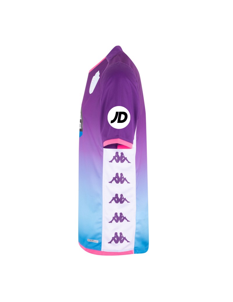 The secondary-change release for 2023-24 features purple/violet graduating into blue, with pink and white trim and an iridescent crest.