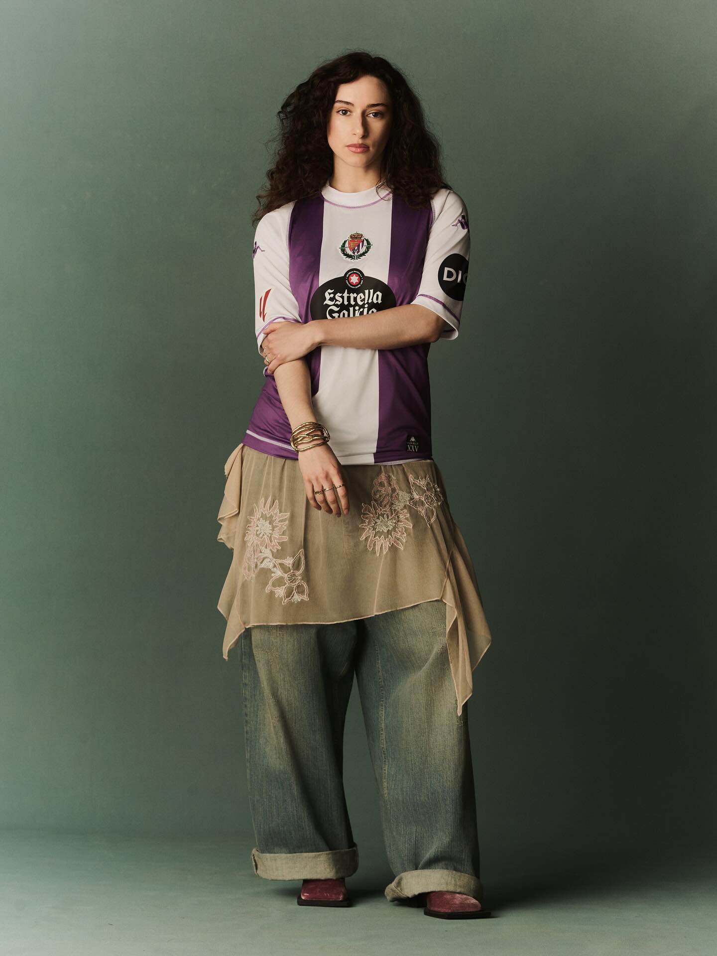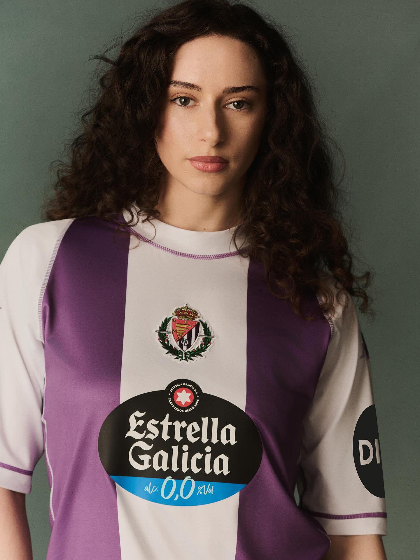 The Real Valladolid football jersey features the club’s traditional white and violet vertical stripes, along with the Kappa logos, sponsor branding and club crest.