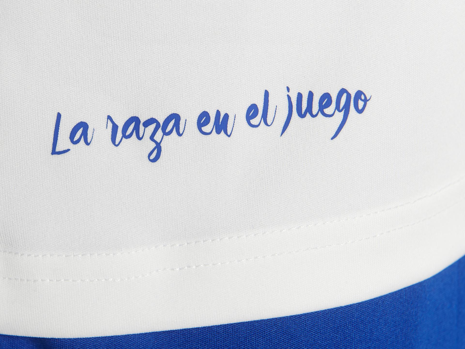 Near the hem there is printed script - 'La raza en el juego' - and there are sponsors keeping to the outlined palette front and centre and on the lower back. The kit is completed with blue shorts and most likely white socks.
