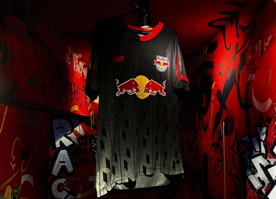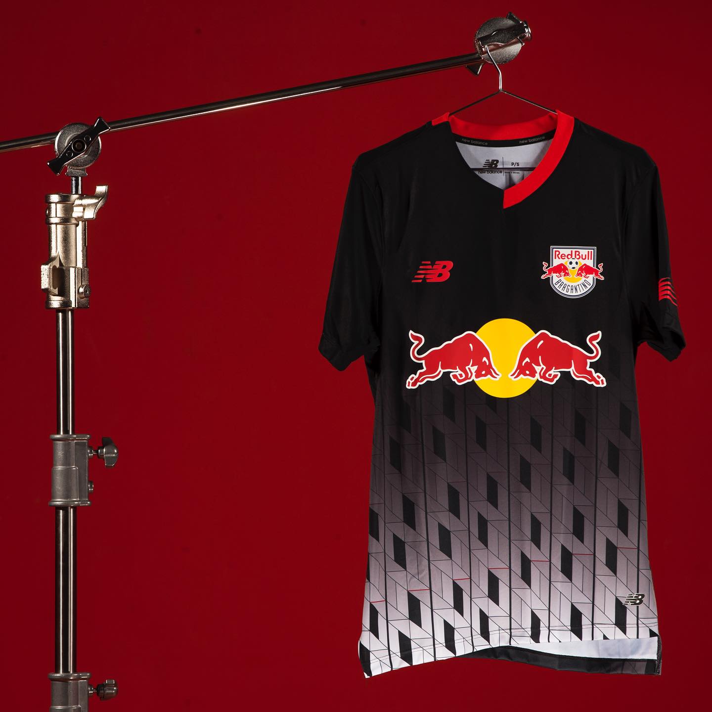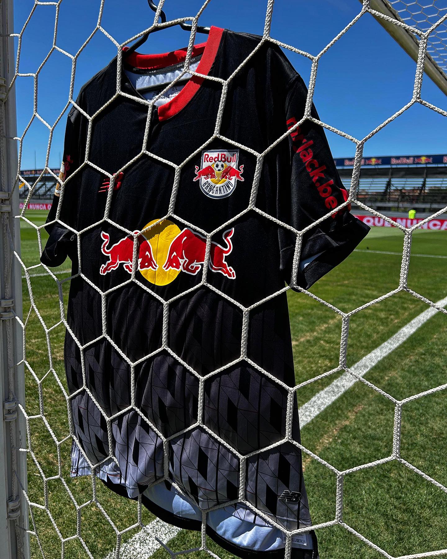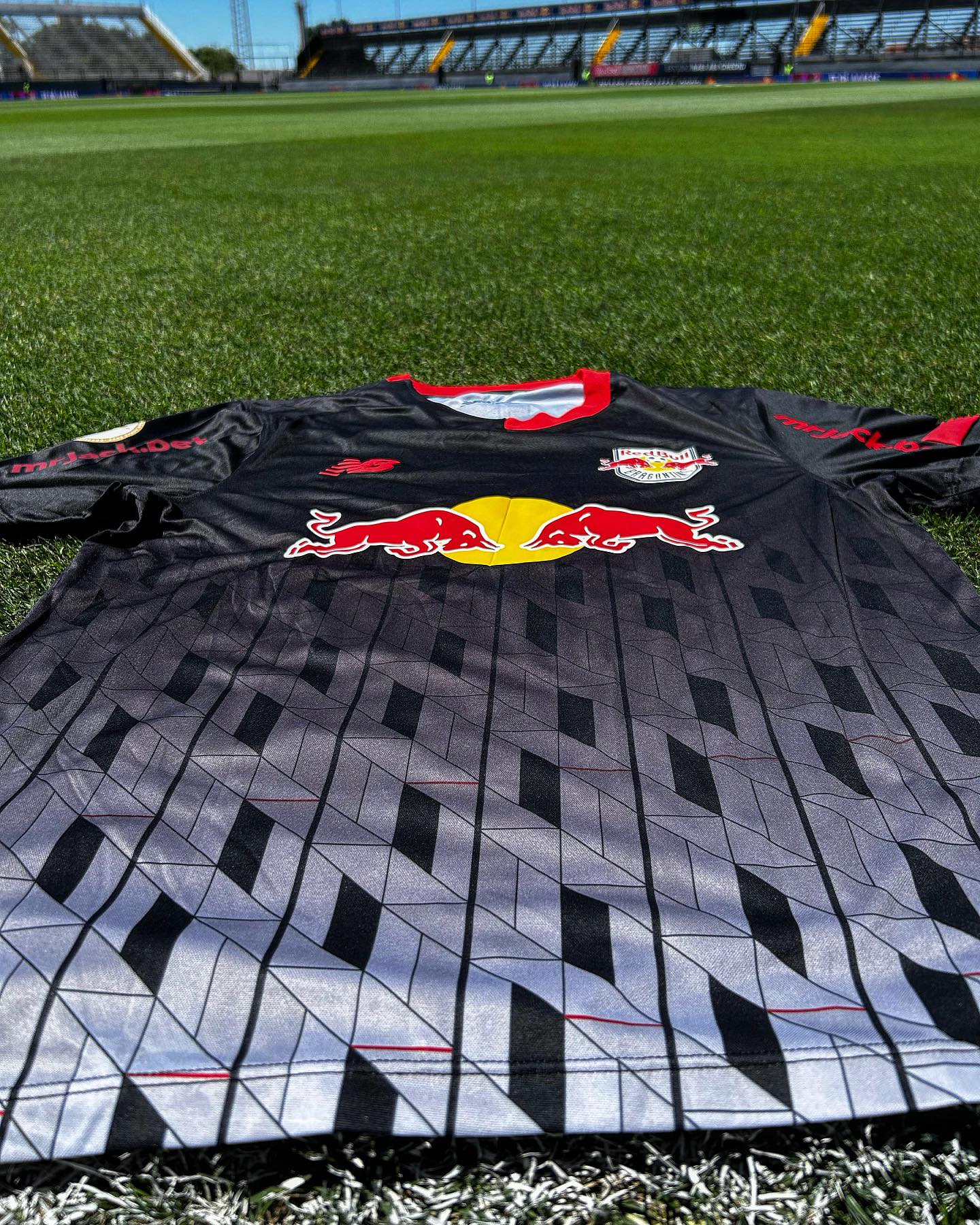 The 2023-24 ostensible secondary-change release by New Balance is in black with patterning that nods to a graphical pattern used on an array of Bragantino designs, particularly prior to the Red Bull takeover.