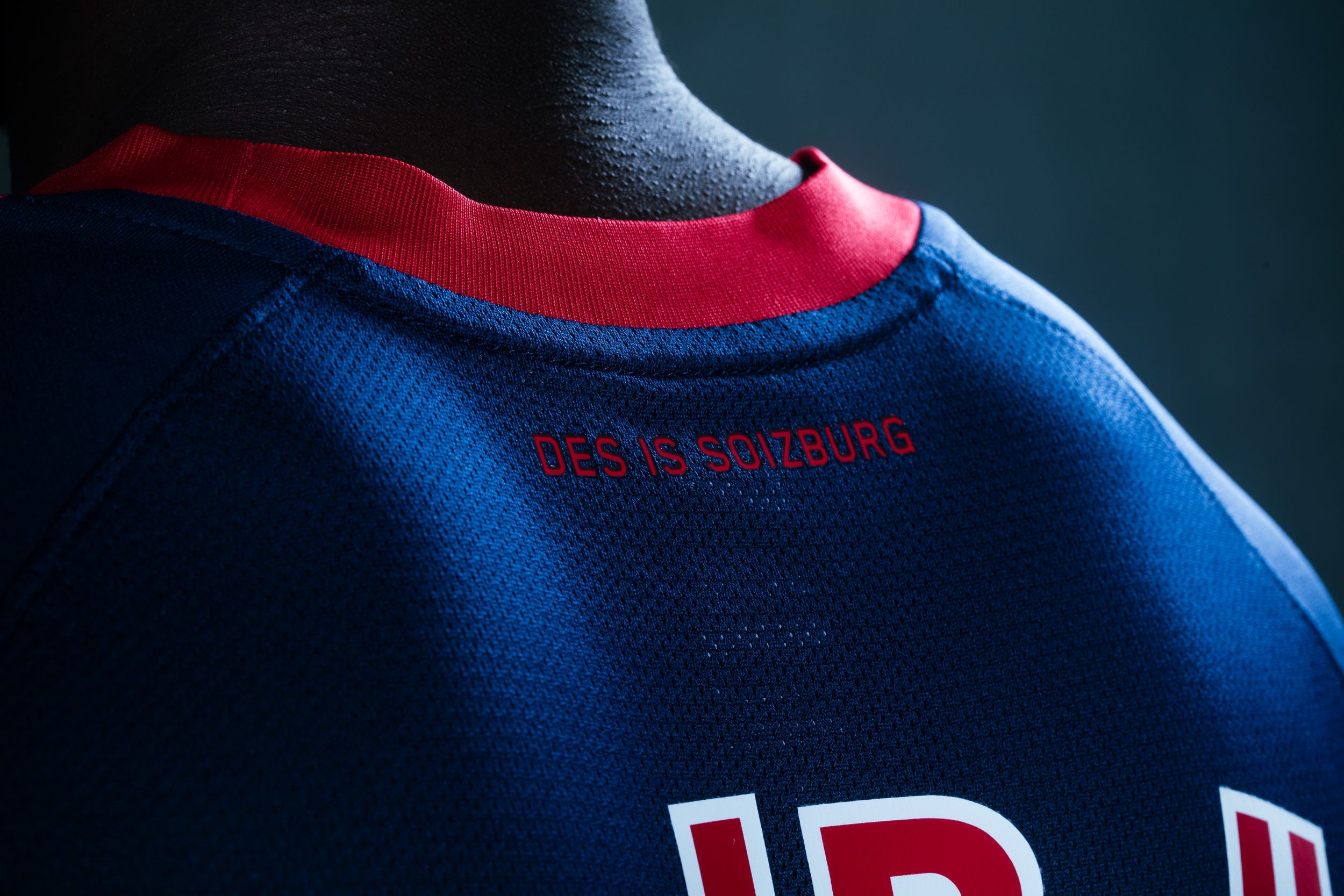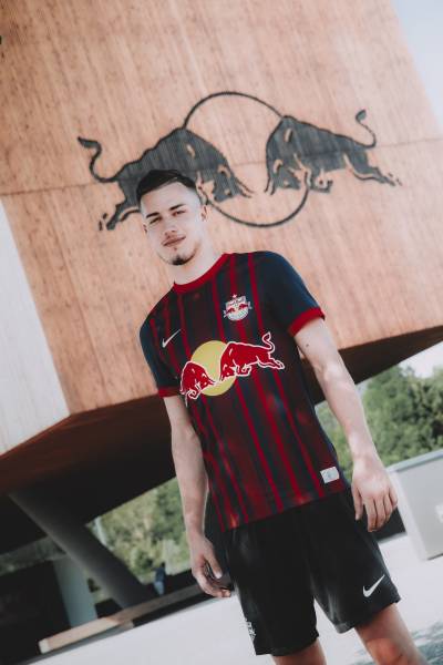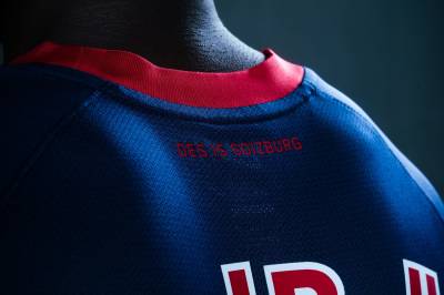 In dark/navy blue and red, with stylised striping to the trunk, the new secondary design carries a full-colour crest and an energy-drink logo in the main sponsor position, with supplier Nike’s Swoosh logo in white and “DES IS SOIZBURG” above the “Red Bulls” wordmark on the upper back.
