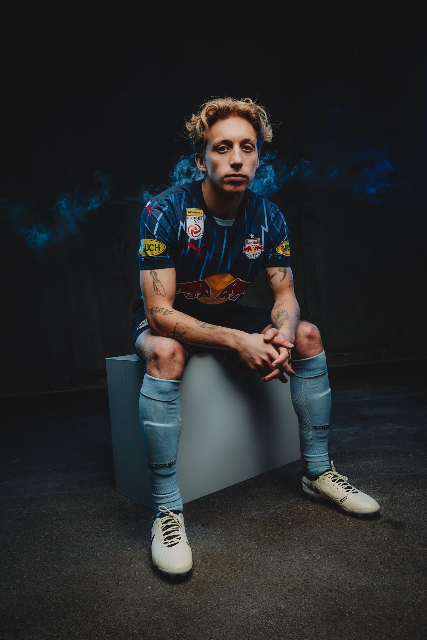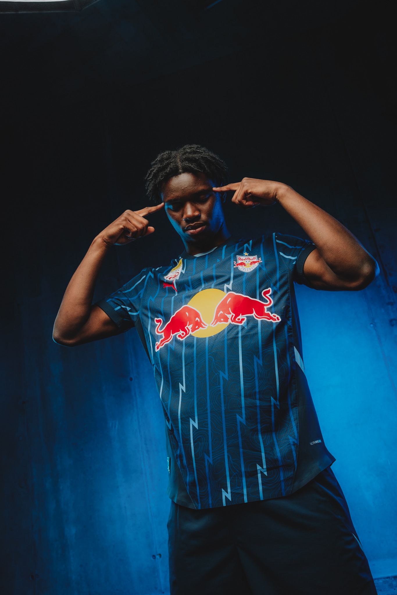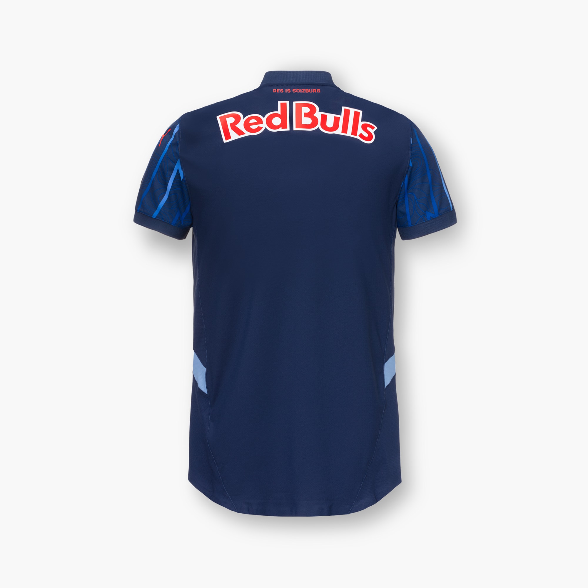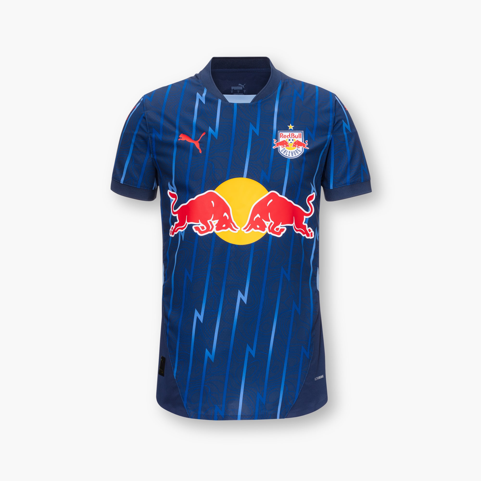 The new Puma release for the Austrian Bundesliga side is in tones of blue, with the “Club Navy” base embellished with lightning bolts and a stylised topographical take on the landscape of the state of Salzburg.