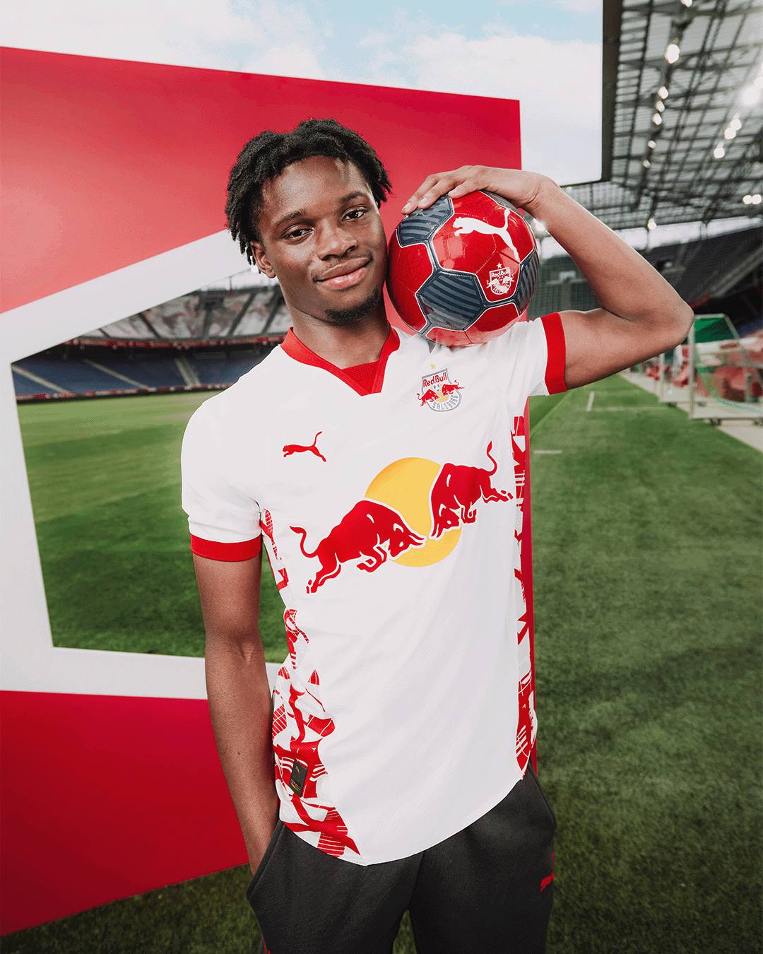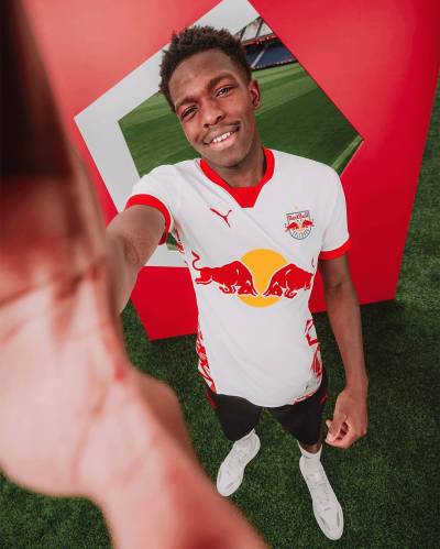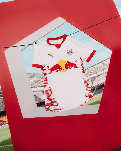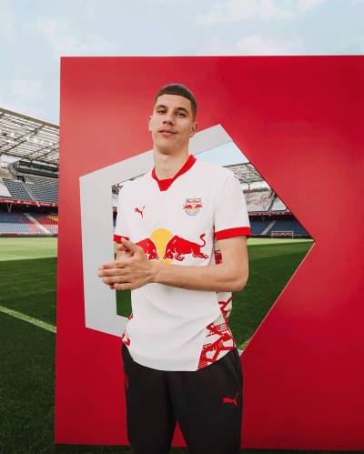 The 2024-25 design, representing the first primary release of the new Puma era, is in white with red neck and cuffs and red embellishment on the sides of the trunk inspired by the architecture of Die Roten Bullen’s Red Bull Arena home ground.