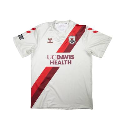 The Hummel kit adopts a classic stone white backdrop, accented with a sash in Old Glory Red and Resilient Red, honouring the club's journey and its roots within the community. The sash mirrors the primary kit's diagonal line, converging into the club's badge, which has been updated for a new chapter yet preserves the iconic bear and star symbols from the California state flag, epitomising Sacramento's football heritage.