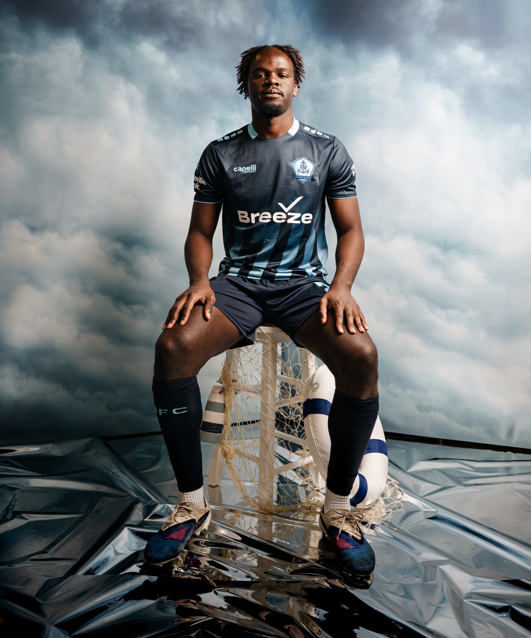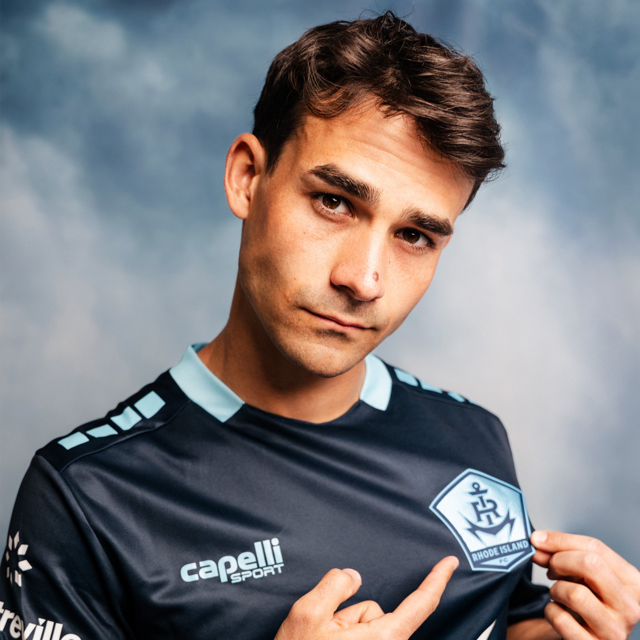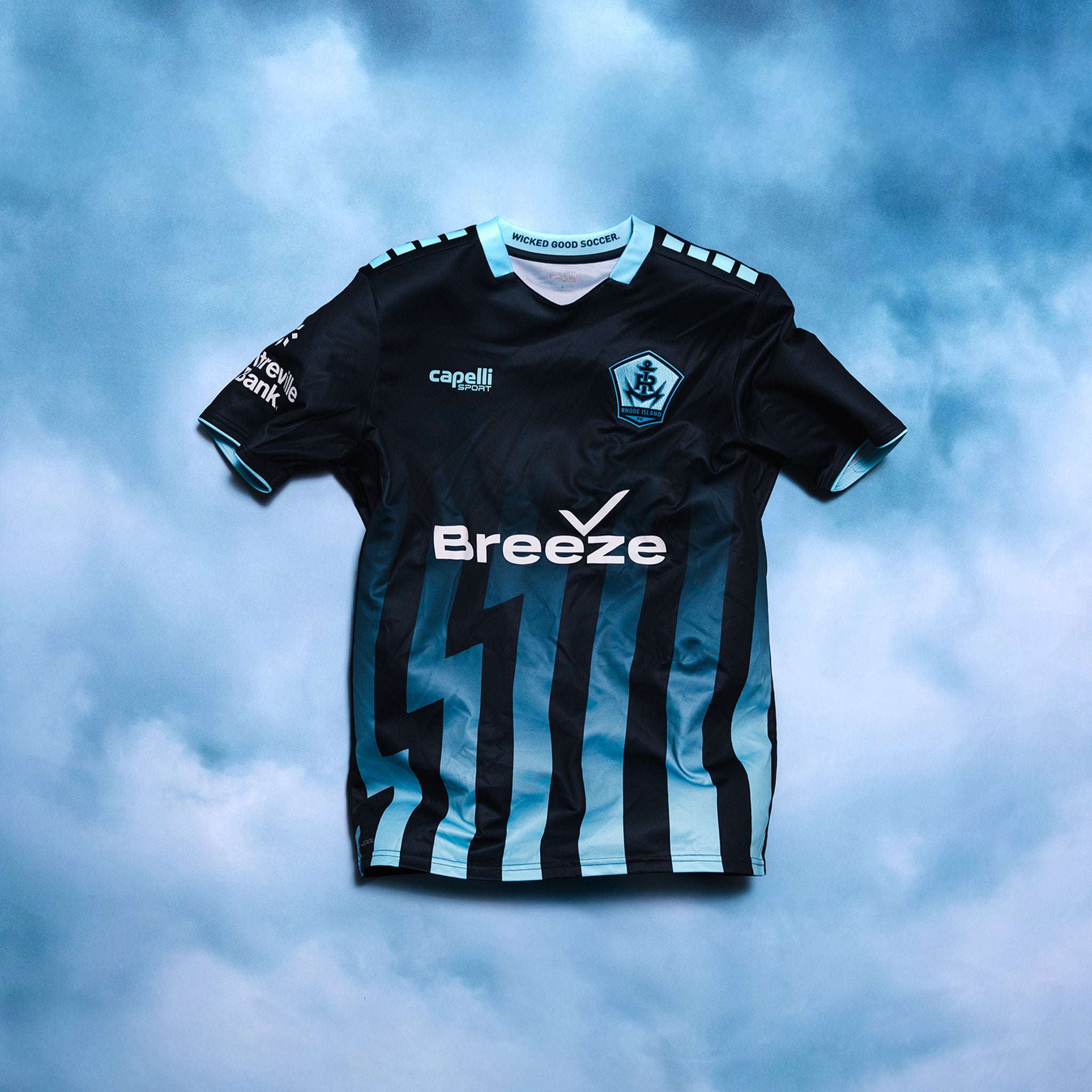 Further details include a light blue collar and matching sleeve trim. Capelli Sport branding is repeated on the shoulders, while the interior collar carries the phrase “Wicked Good Soccer.” The new Rhode Island football shirt will be worn throughout the 2026 USL Championship campaign and is completed with coordinated dark River Blue shorts and socks.