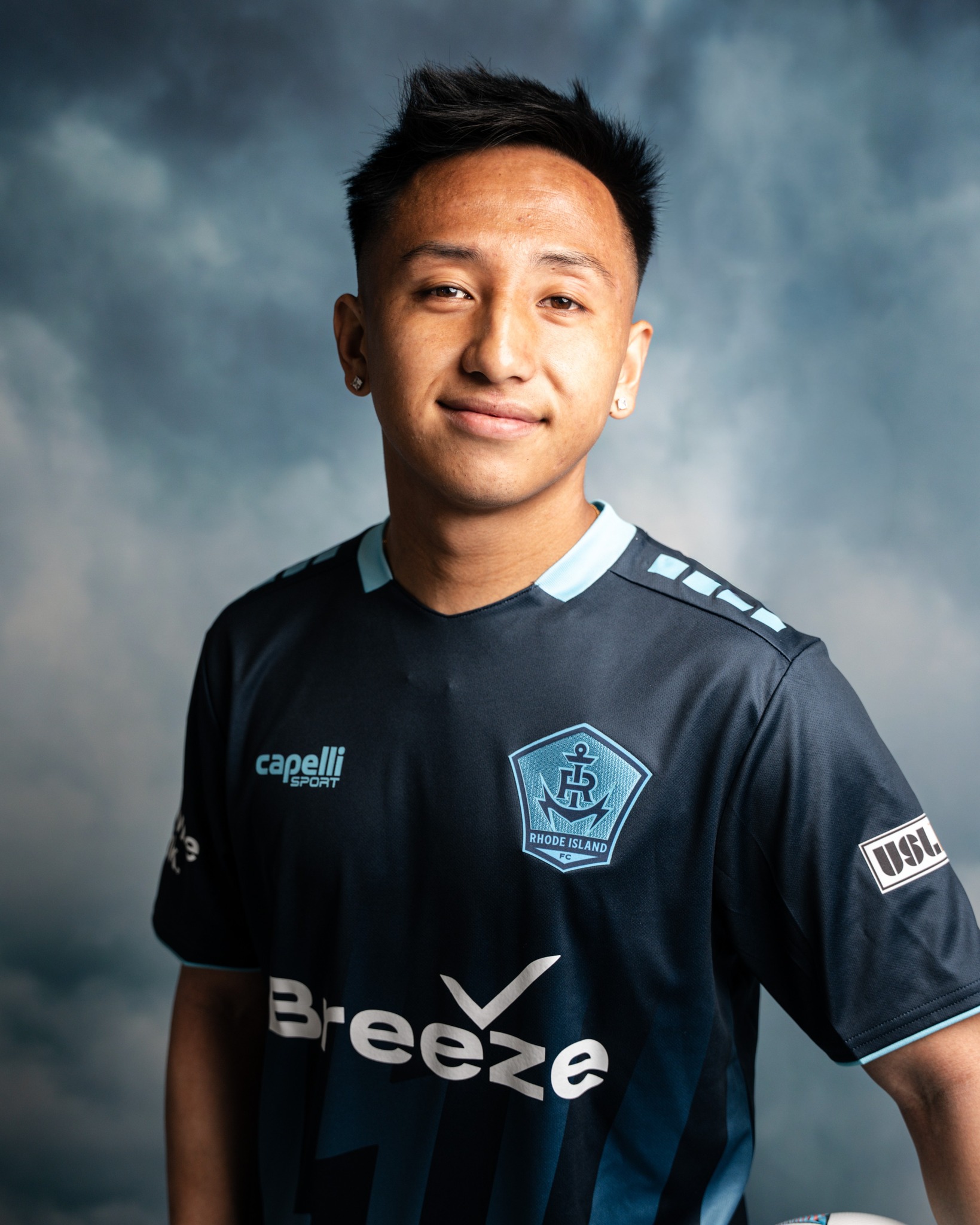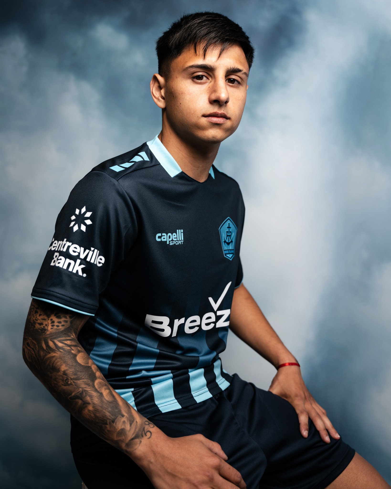 The Rhode Island FC badge appears on the left chest in light blue, positioned opposite the Capelli Sport logo. Across the centre of the shirt sits the Breeze Airways shirt sponsor in white. Additional partners appear across the shirt, with Centreville Bank displayed on the sleeve and Rhode Island Energy positioned on the upper back beneath the collar.