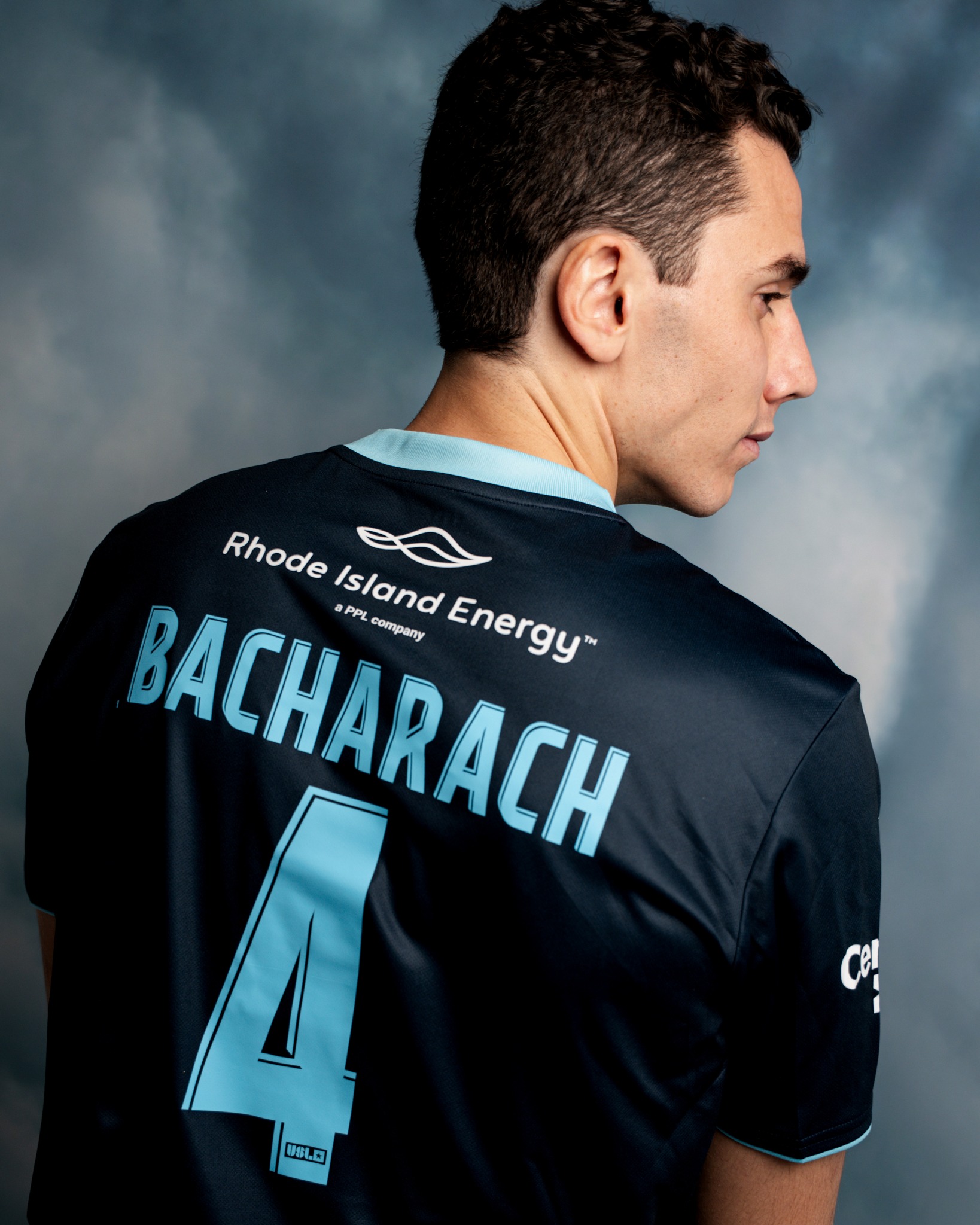 The new Rhode Island jersey features a dark River Blue base combined with light blue graphic elements rising from the lower section of the shirt. These vertical shapes are derived from the club’s original wave motif and form lightning inspired bolts that extend upward across the body towards the club crest.