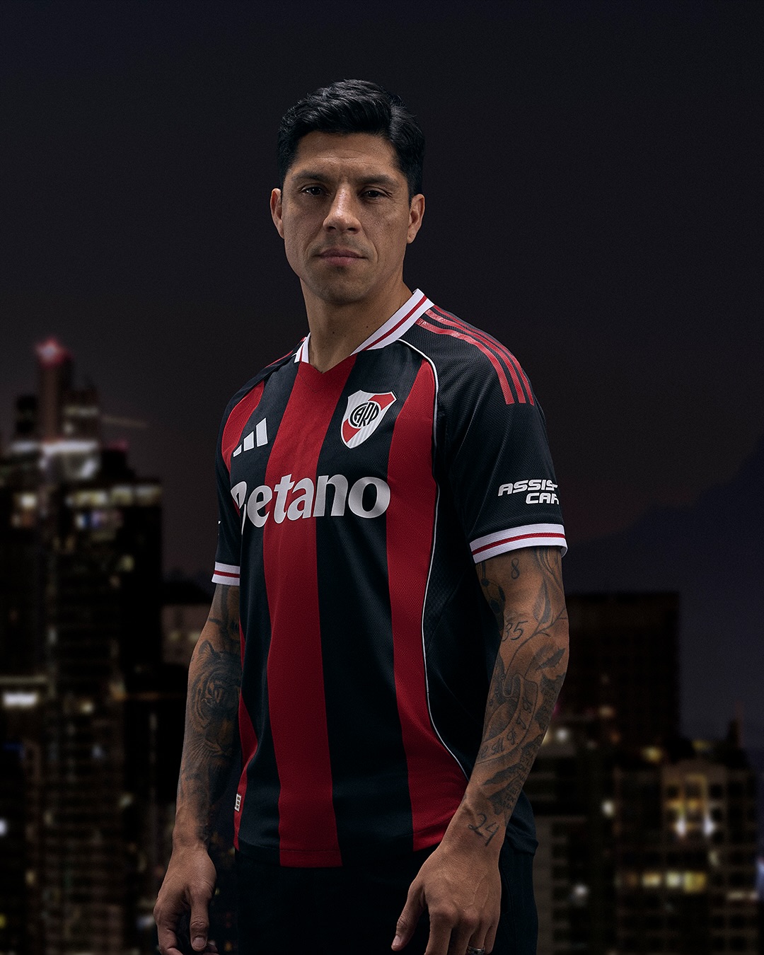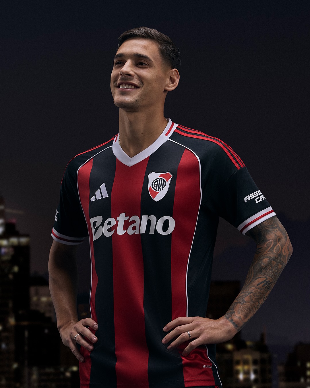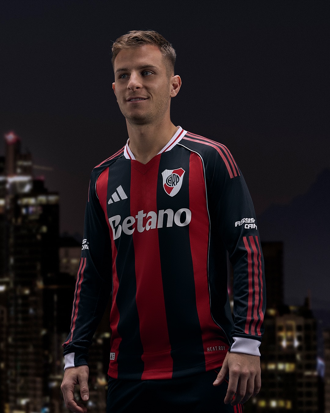 The River Plate crest sits on the left chest opposite the adidas logo, with Betano as the main sponsor and Assist Card on the sleeve. The back of the collar includes a stylised “River Plate” label.