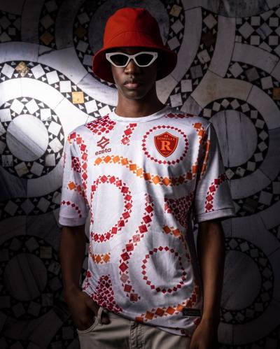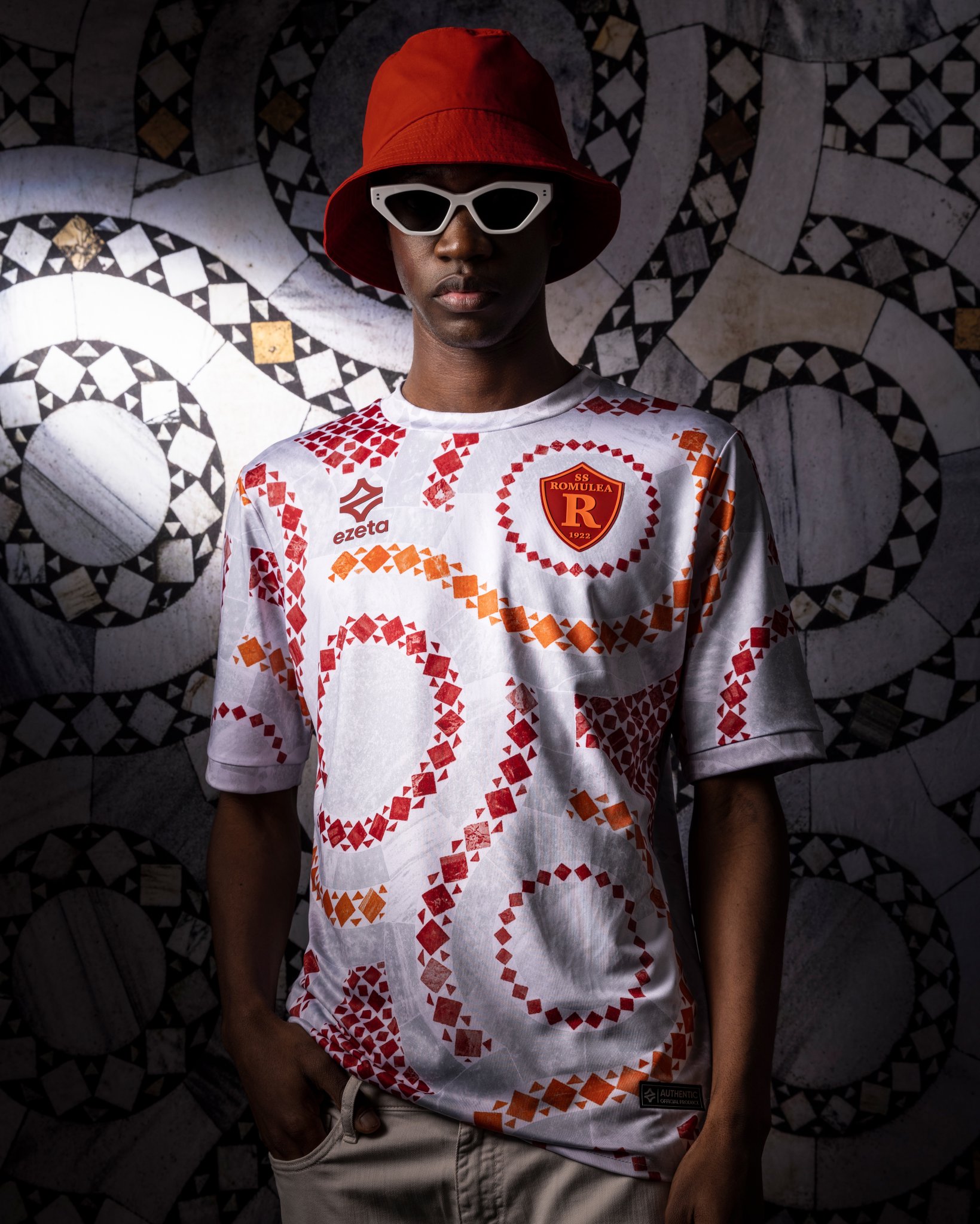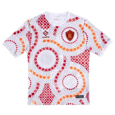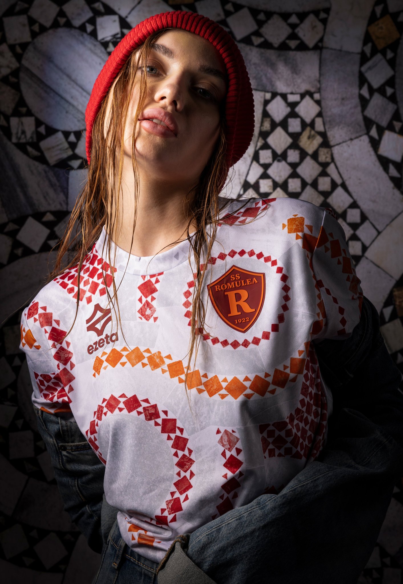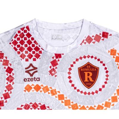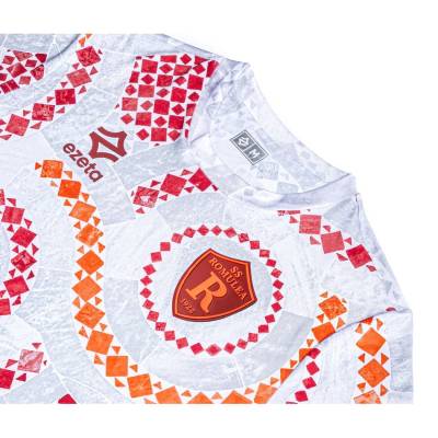 This striking new Ezeta design, made up of grey “amaranto” and “oro” - in practice, grey, red and orange - embellishing a white base, is the 2024-25 Società Sportiva (SS) Romulea Away shirt.