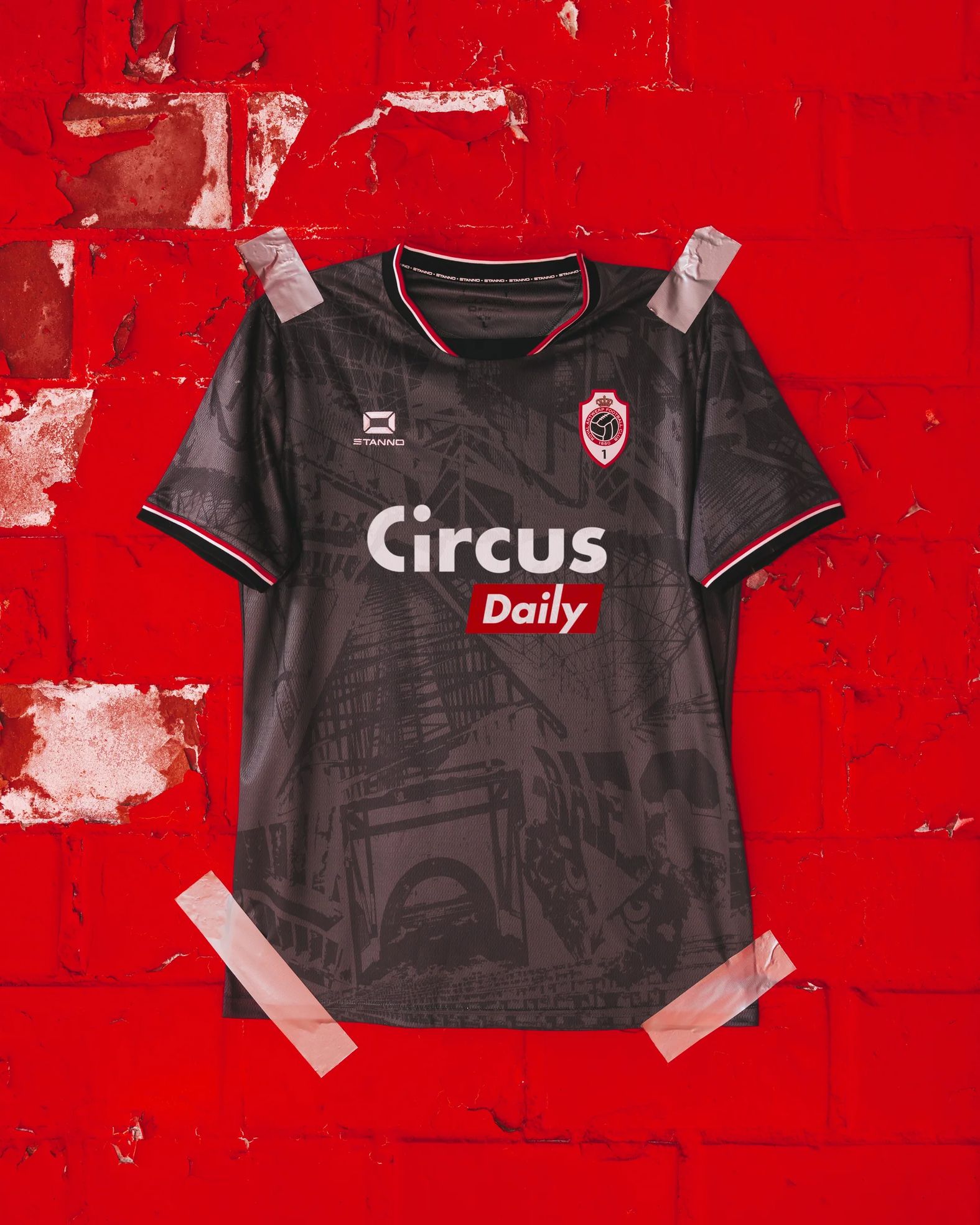 On the chest, the Stanno logo and the Royal Antwerp crest appear, with main sponsor Circus Daily displayed across the centre in white and red. Additional sponsors Heylen Vastgoed and Ghelamco are printed on the back. The inside collar carries Stanno branding, while the woven crest is outlined in red and gold to emphasise its placement on the front. The shirt will be paired with matching dark grey shorts and socks to form a full kit.