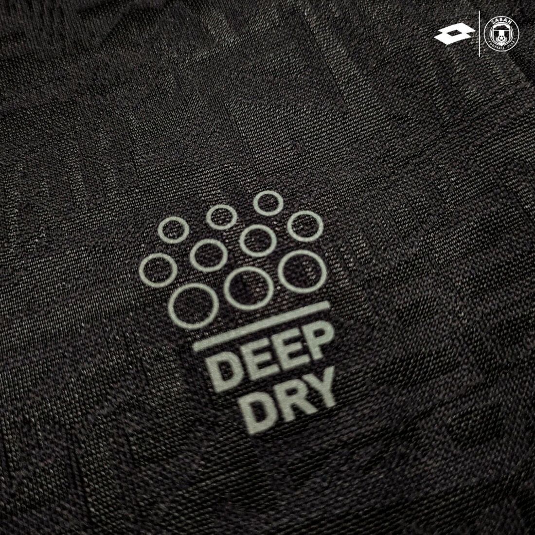 Produced by Lotto, the pseudo-“blackout” design incorporating “Deep Dry” technology is in dark grey with black detailing.