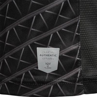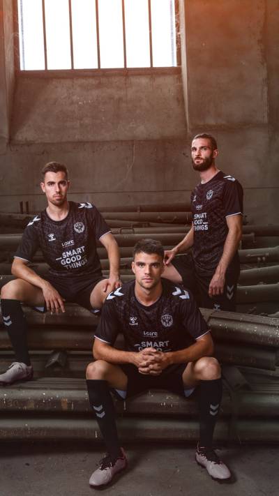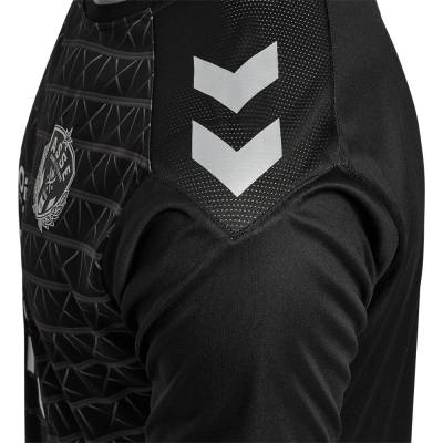 Otherwise black, save for the neck-and-cuff trim and the Hummel chevrons on the shoulders, the shirt forms the principal element of a kit which is completed with black shorts and socks to form a nominally single-coloured secondary-change outfit.