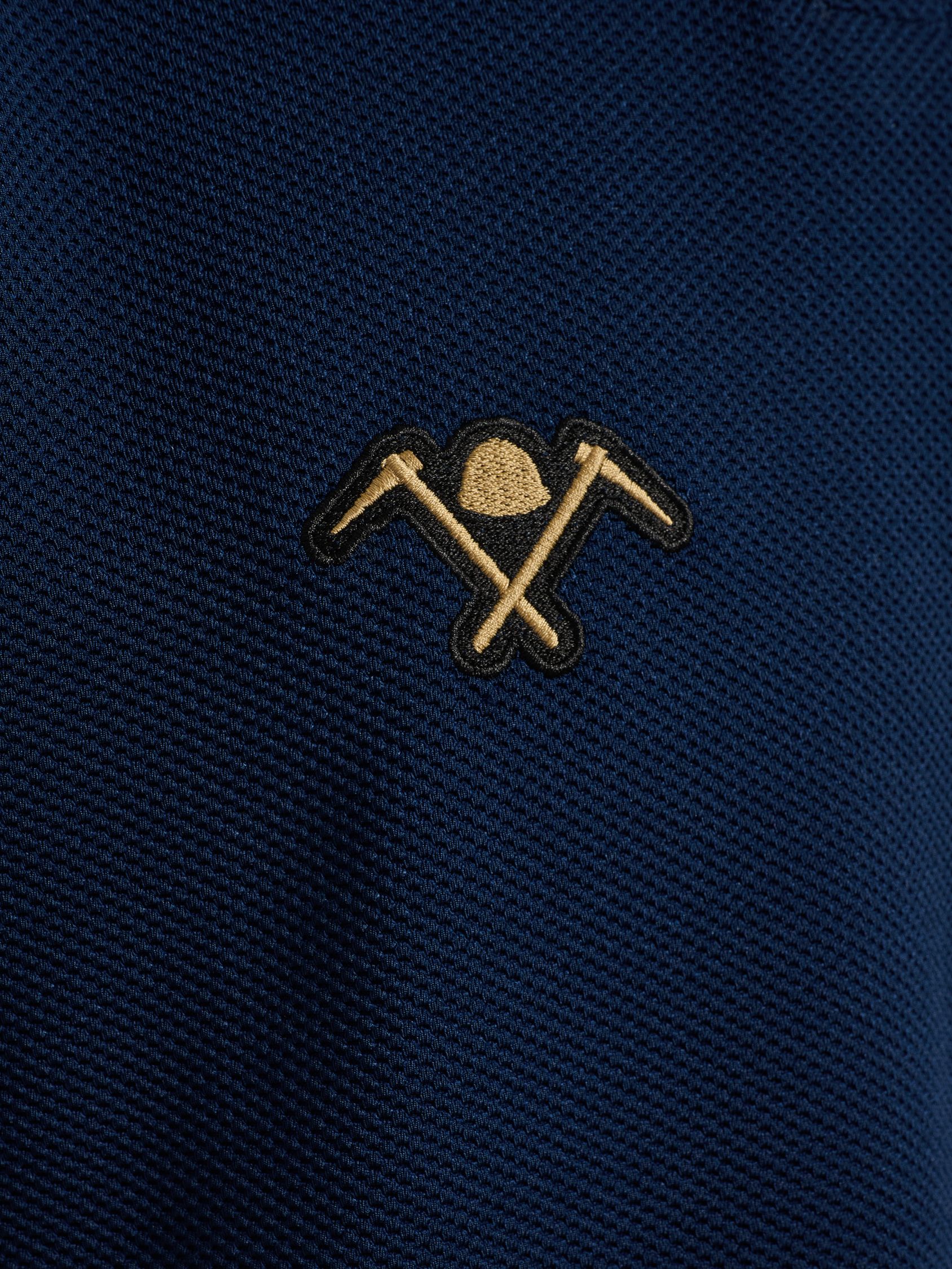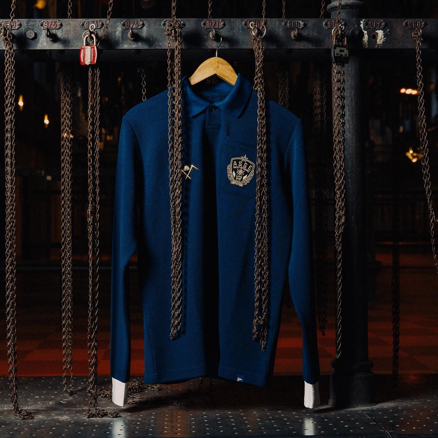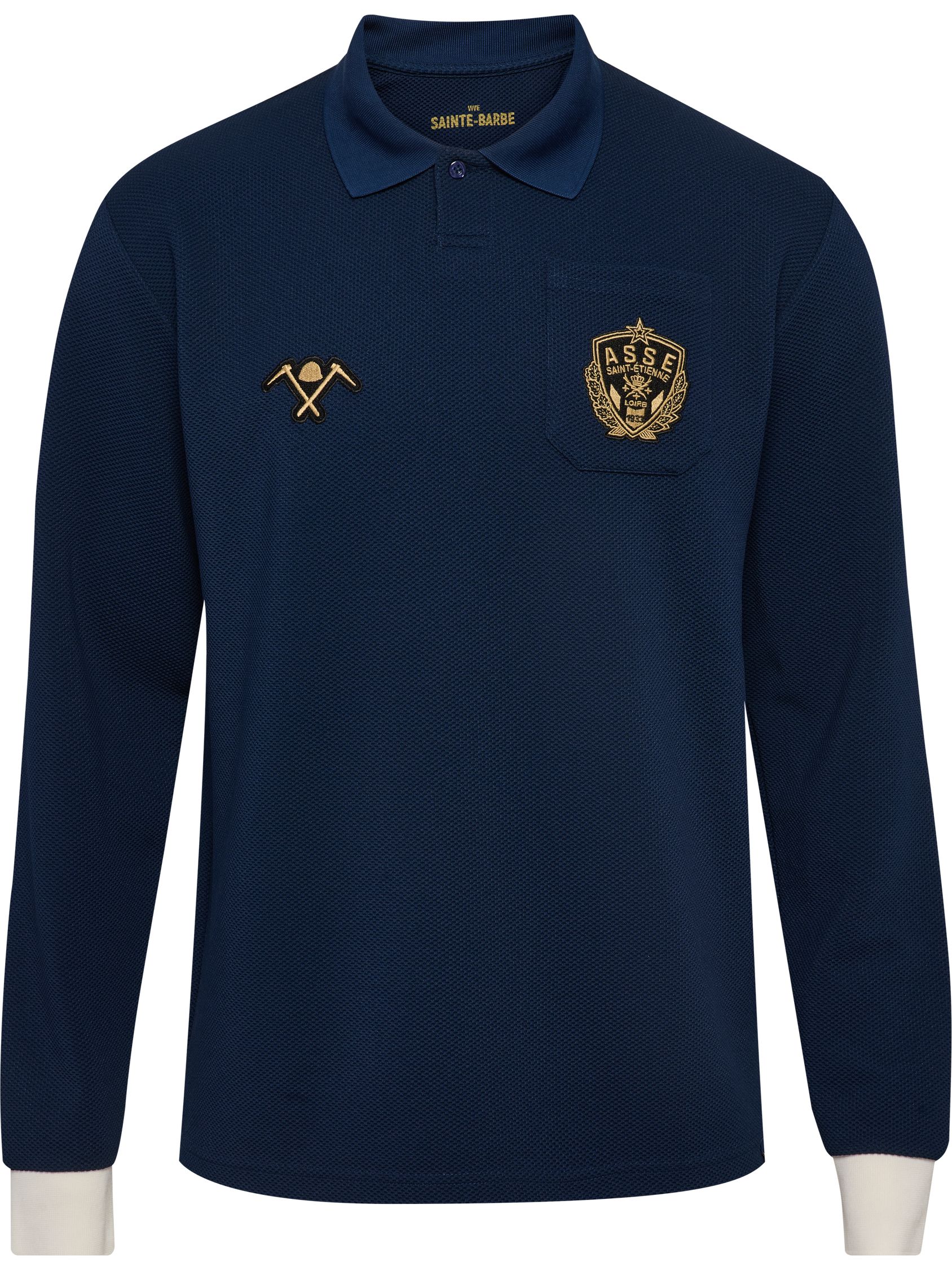 The long sleeve Saint-Étienne jersey is produced in a dark navy colour reminiscent of traditional workwear and features a polo collar with a two button placket. White cuffs appear at the sleeve ends, while a chest pocket houses an embroidered ASSE crest presented in a gold tonal style. A second emblem showing crossed tools is positioned on the right chest, referencing historic mining symbols associated with the region.
