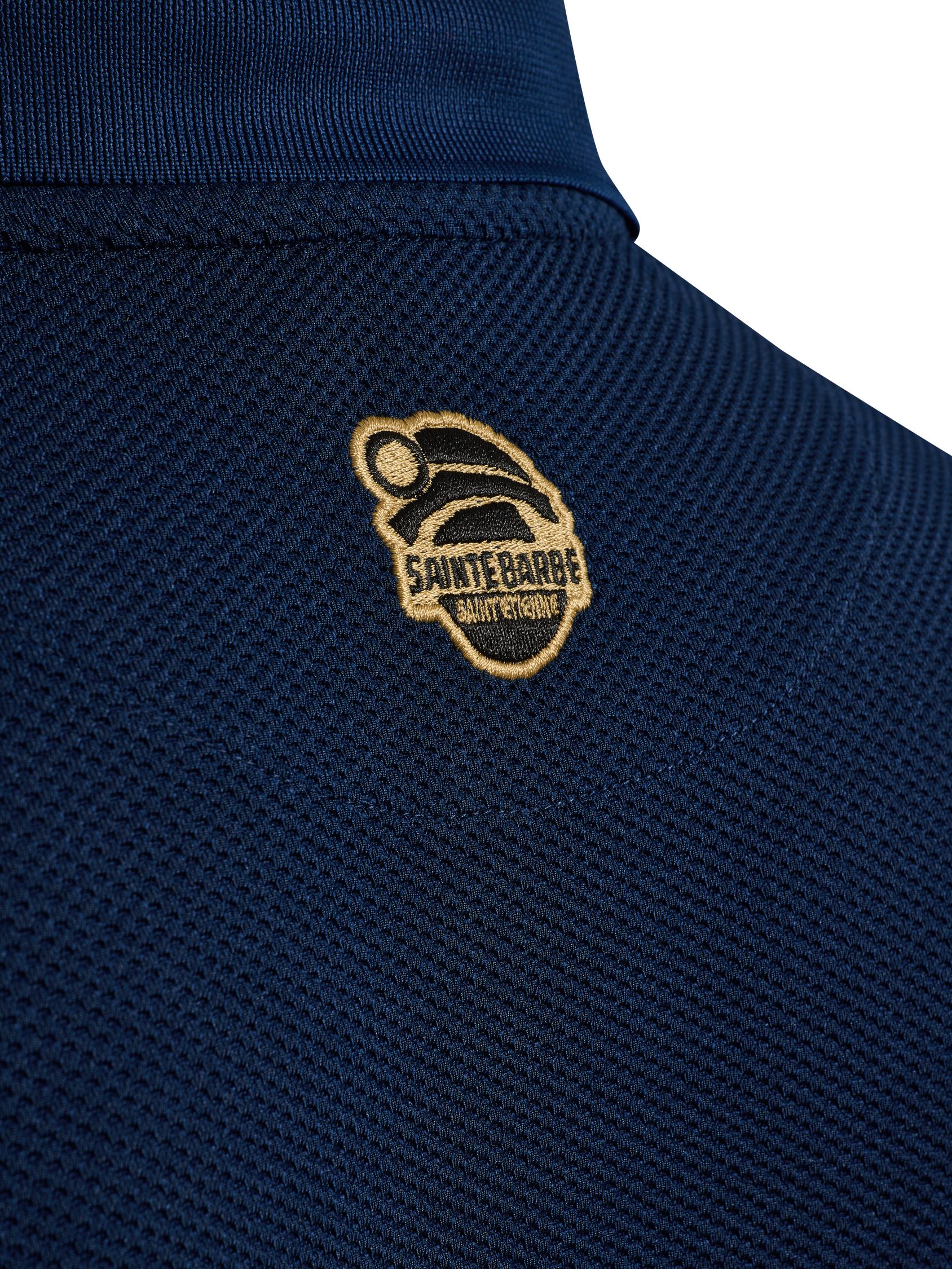 Further detailing includes a small Sainte-Barbe mark placed below the rear collar, again using a gold thread that matches the front applications. The textured fabric construction gives the jersey a structured appearance suitable for casual wear and supporter use. The shaped hem and extended sleeves complete the layout.