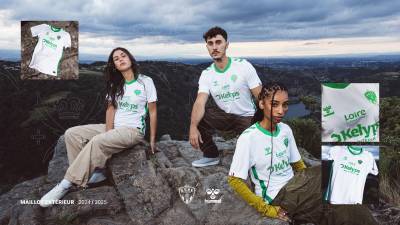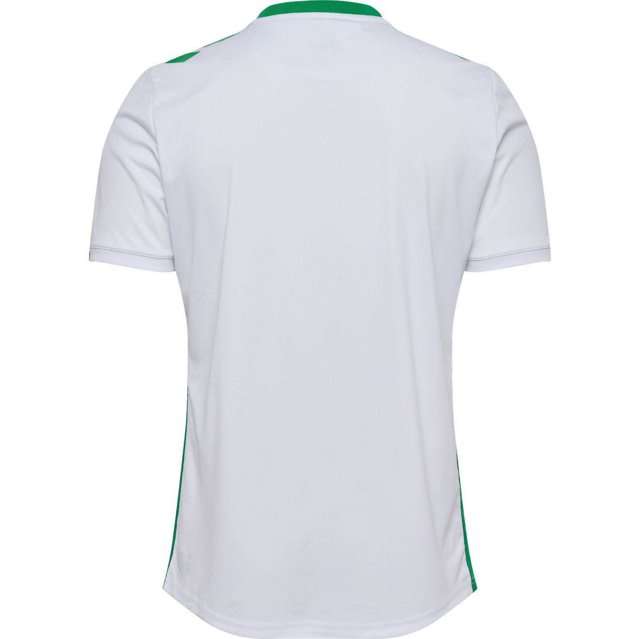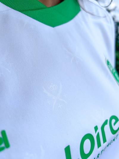 The new secondary release for Les Verts is in familiar white with green - the latter providing the majority of the crest, the branding for supplier Hummel, the sponsor/partner logos, the neck fill and the trim - and boasts an embossed/debossed pattern based on the coat of arms of the city of Saint-Étienne.