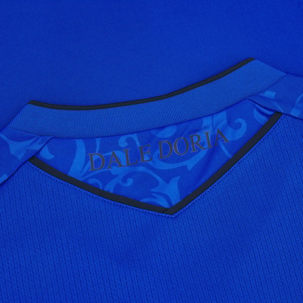 The crest is in full colour, partner/sponsor logos - including Macron’s “Hero”s - are in white, the upper back has a navy “DALE DORIA” legend in reference to a fan chant and while the kit is officially completed with white shorts and blue socks, it has already been worn with the blue Away shorts.