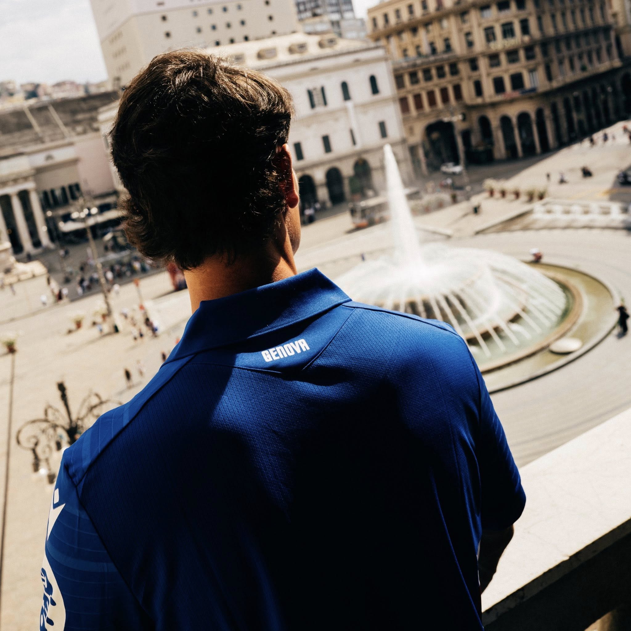 The shirt is royal blue with a V-neck with a fold-over collar and features the club’s classic central band design made up of white, red, black, and white horizontal stripes. Positioned in the middle is the St George’s cross shield, while the upper chest and shoulders display a subtle embossed pattern of concentric circles, inspired by the fountain in Piazza De Ferrari, a symbolic landmark in Genoa.