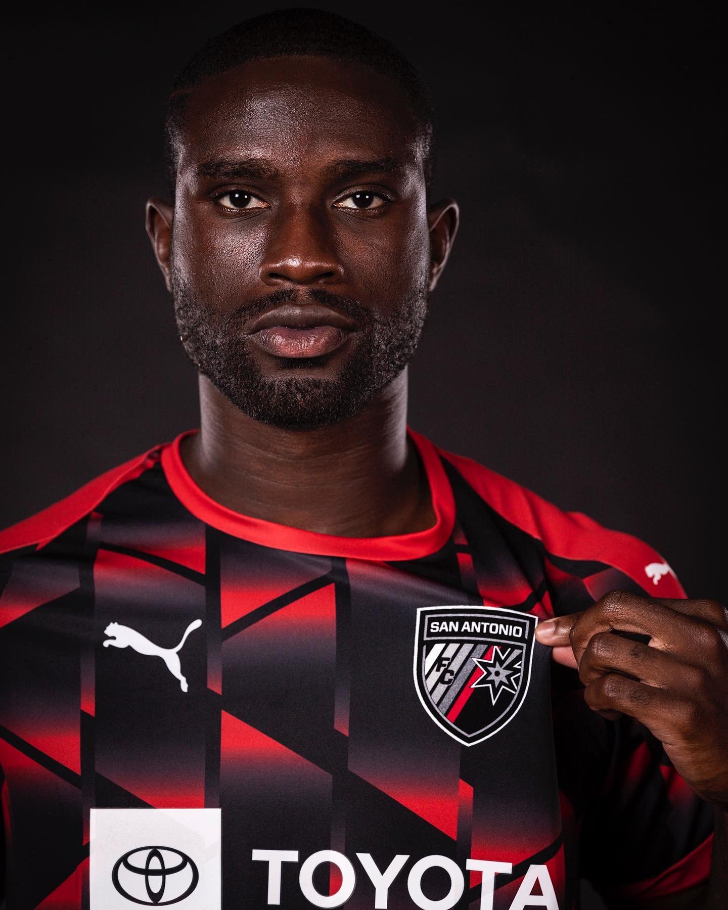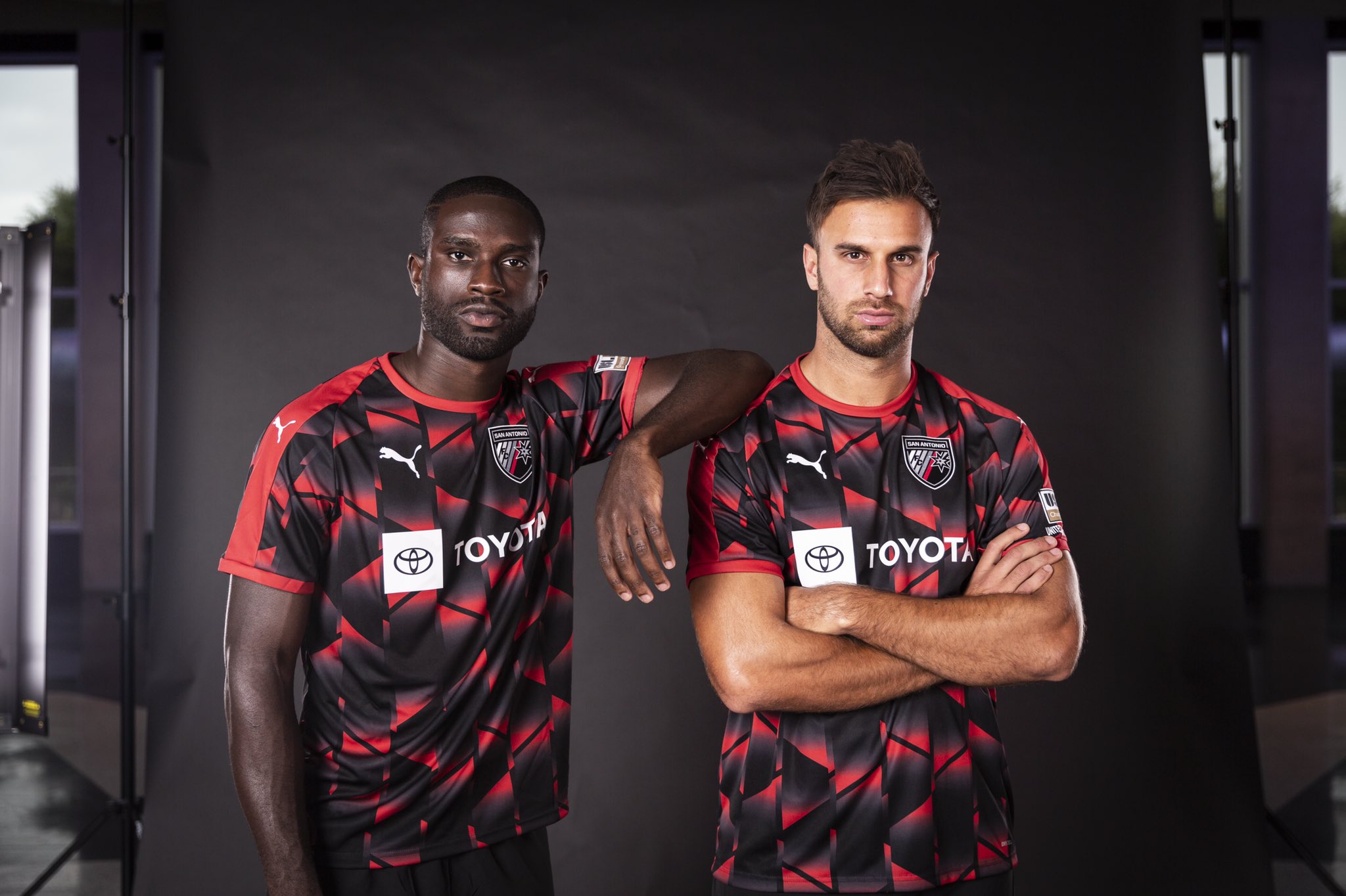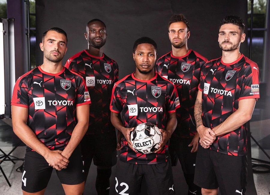 The 2022 design for the Texas-based USL Championship side features an allover pattern in black, grey and red, with the crest in full colour - to match - and supplier Puma’s logos in white.