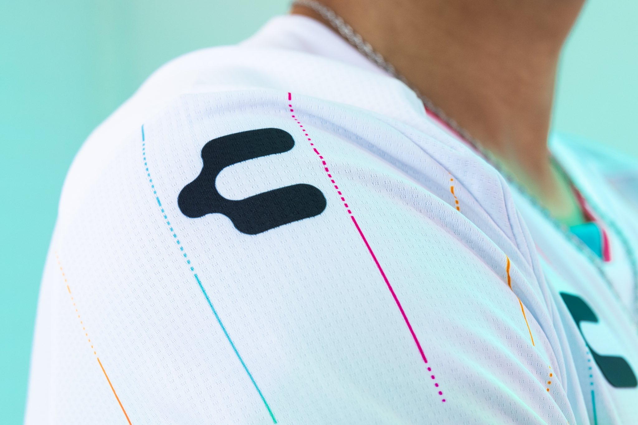 The jersey features a white base with multicoloured pinstripes in red, orange, blue, and green, reflecting the city's vibrant culture and Latino heritage. The sleeve cuffs, collar trim, and side panels incorporate bold splashes of teal and orange.