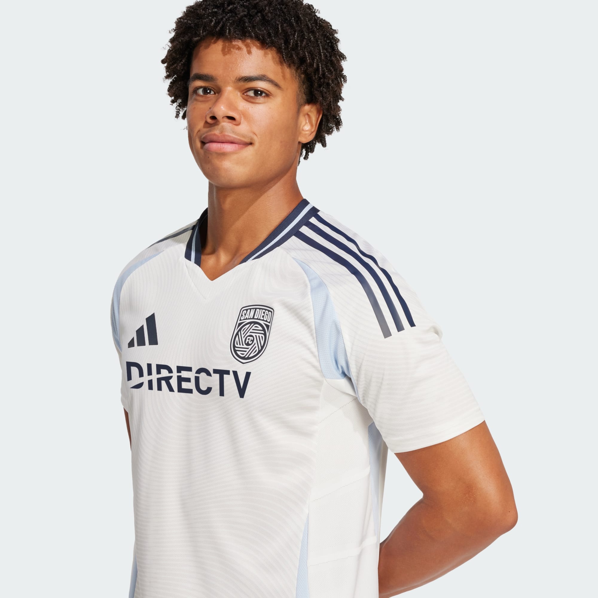 Designed as a blank canvas for the people of San Diego, the adidas kit reflects the club’s mantra, "Woven Into One," inviting fans to shape its identity. Future secondary jerseys will be co-designed with supporters and local artists through workshops and community-driven campaigns, ensuring each design represents the city’s unique culture. The Core White base has a subtle textured pattern that reflects the club’s connection to its community. Azul stripes on the shoulders and neck highlight the club’s identity, while lighter blue accents reference San Diego’s sky and ocean.