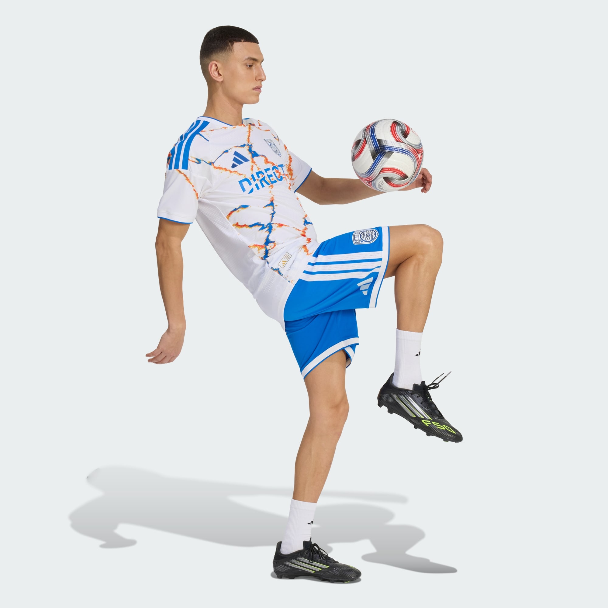 A front jock tag features the initials SDTJ, referencing the San Diego and Tijuana region. On the back neckline, Sin Fronteras is printed as a sign off detail. The new San Diego football shirt is completed with bright blue shorts featuring white adidas striping and the club crest, paired with white socks.