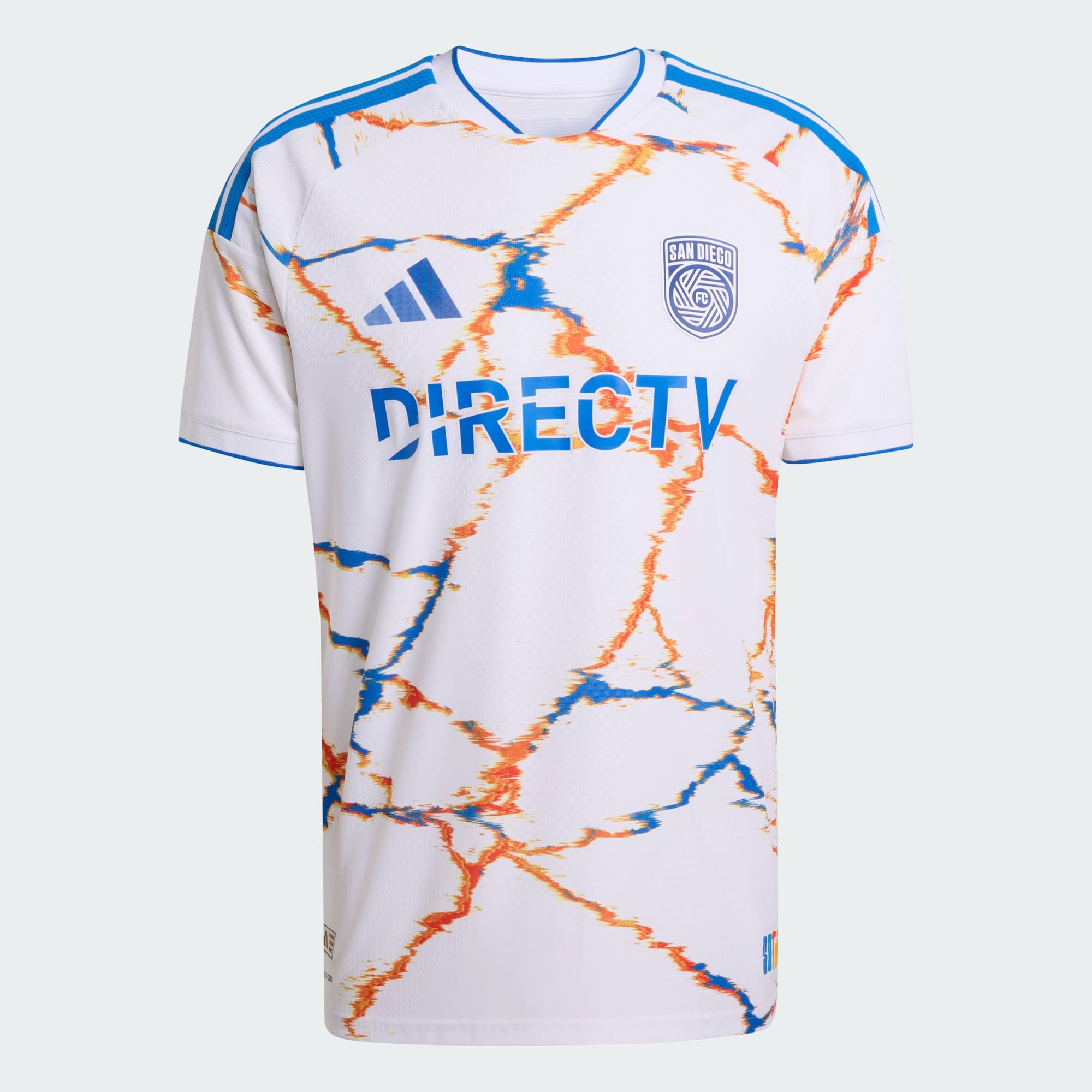 The new San Diego jersey has white base with an all over crackled graphic in blue and orange running across the front and sleeves. The abstract pattern creates intersecting lines across the body, while the reverse remains largely plain white with structured ventilation zones integrated into the fabric. Blue adidas three stripes run along the shoulders and a blue trim finishes the V neck collar and sleeve cuffs.
