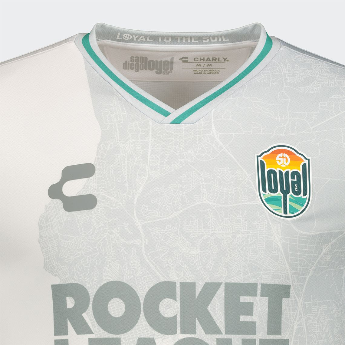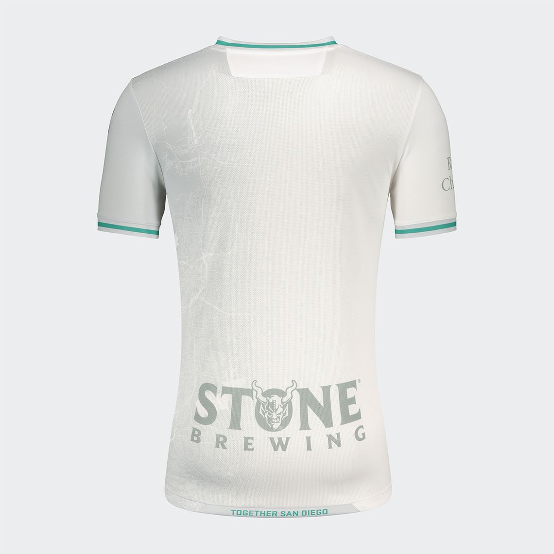 The away kit, white with gray lettering, features the entire map of San Diego County.
