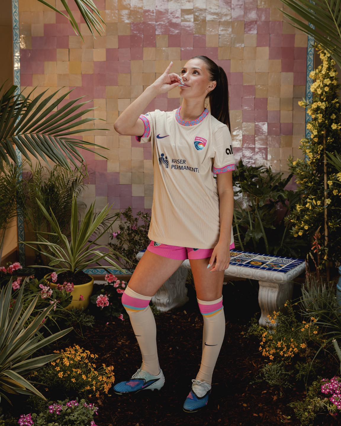 Created in partnership with Nike, the new San Diego Wave jersey takes inspiration from the architecture and decorative tilework associated with Balboa Park. The base of the jersey is rendered in a light sand (Sanddrift) tone, complemented by a ribbed crew neck and sleeve cuffs featuring a multicoloured pattern in pink, orange and blue. The same vibrant detailing appears around the collar, referencing the handcrafted tile motifs found throughout the park’s historic buildings.