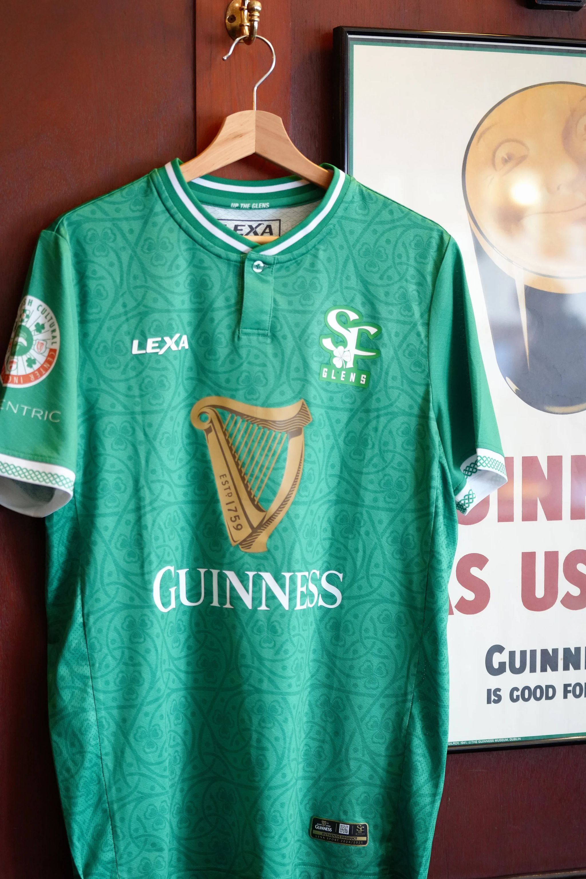 The new Lexa primary release for the San-Bruno, California-based side is in green with white and features sublimated Irish iconography along with Celtic knots on the sleeves and the overlaid branding of sponsor Guinness.