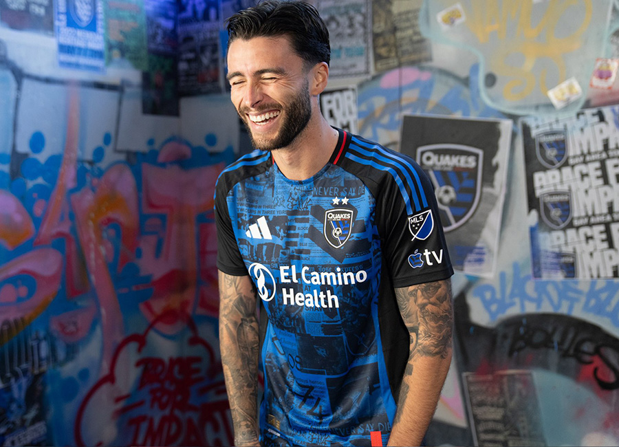 Designed in collaboration with Punk rock veteran Lars Frederiksen, the adidas jersey pays tribute to the Bay Area’s punk rock culture while celebrating the club’s 51-year history. The design features a bold flyer collage incorporating headlines, handwritten elements, and distorted bitmap graphics that capture the energy of both the punk scene and the Earthquakes. The traditional black and blue colour scheme is accented with red around the collar, while El Camino Health, the team’s Official Jersey Partner, is displayed on the chest.