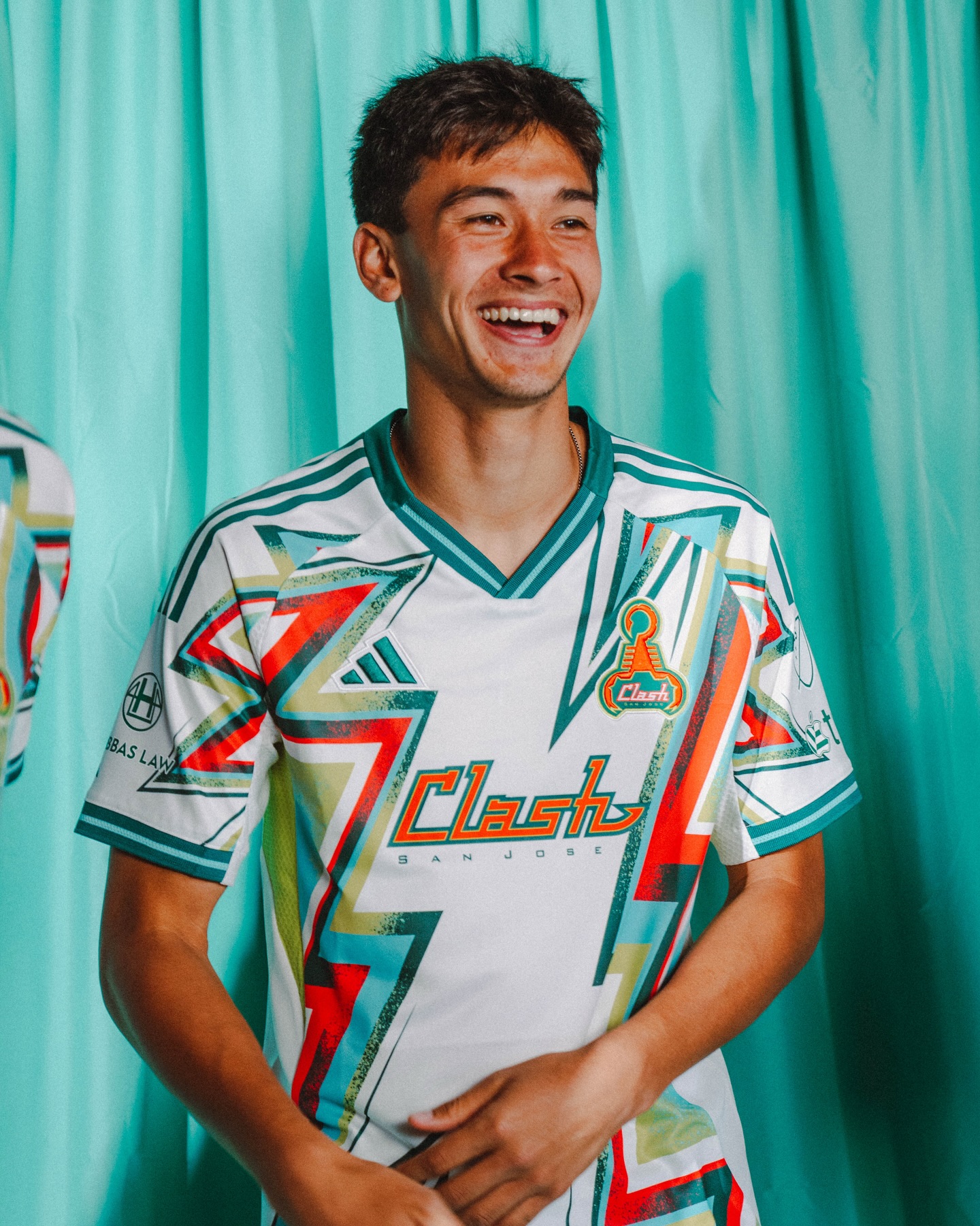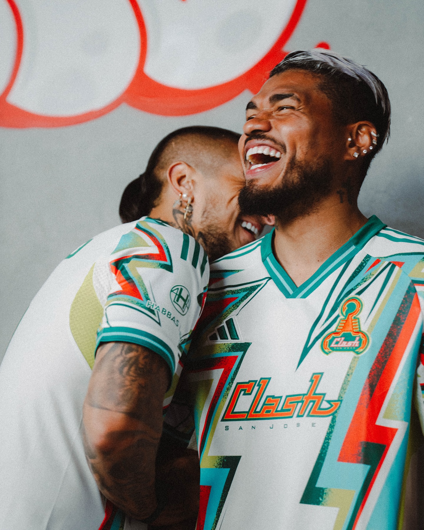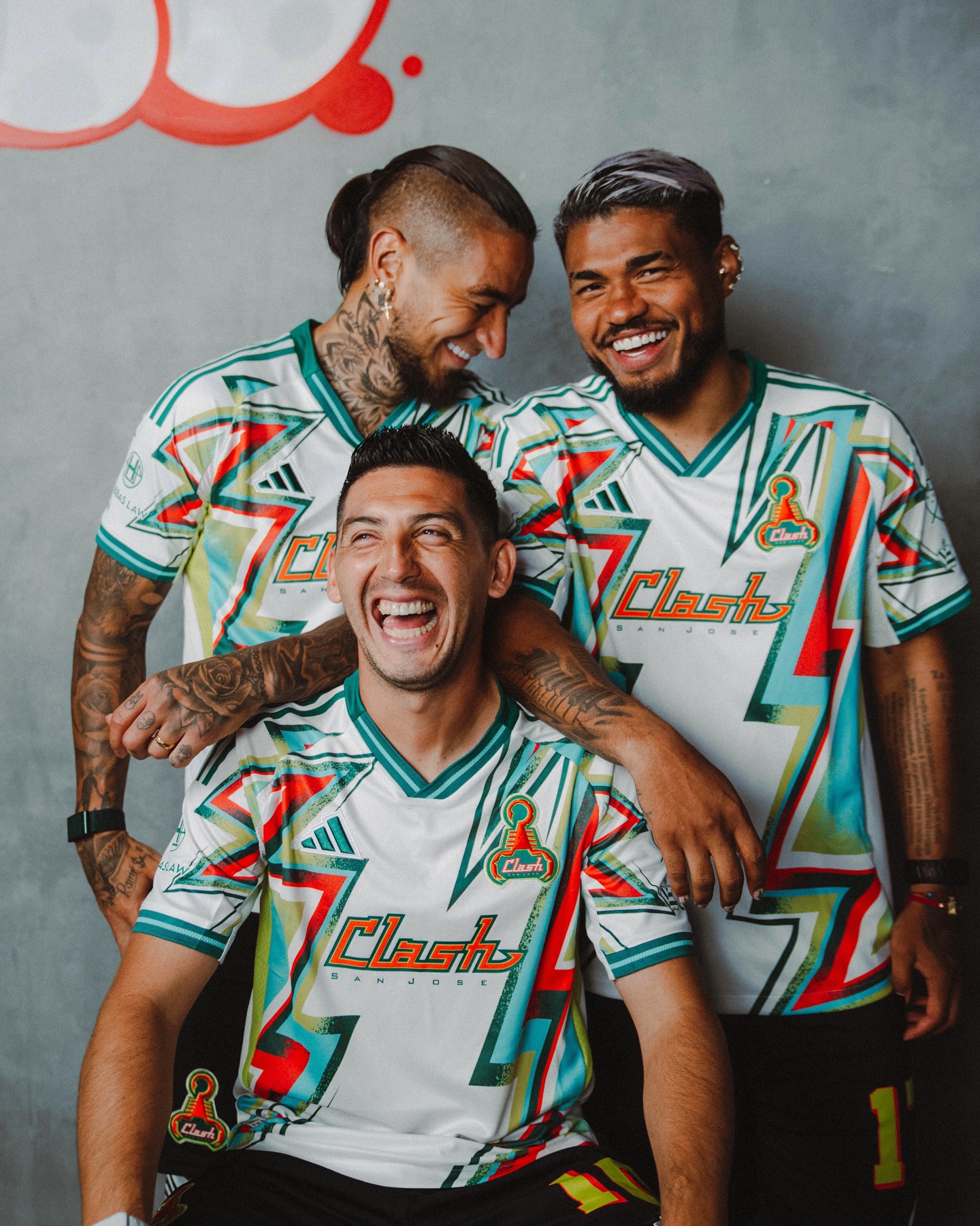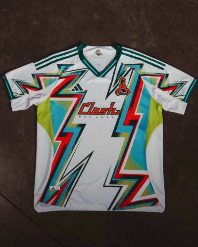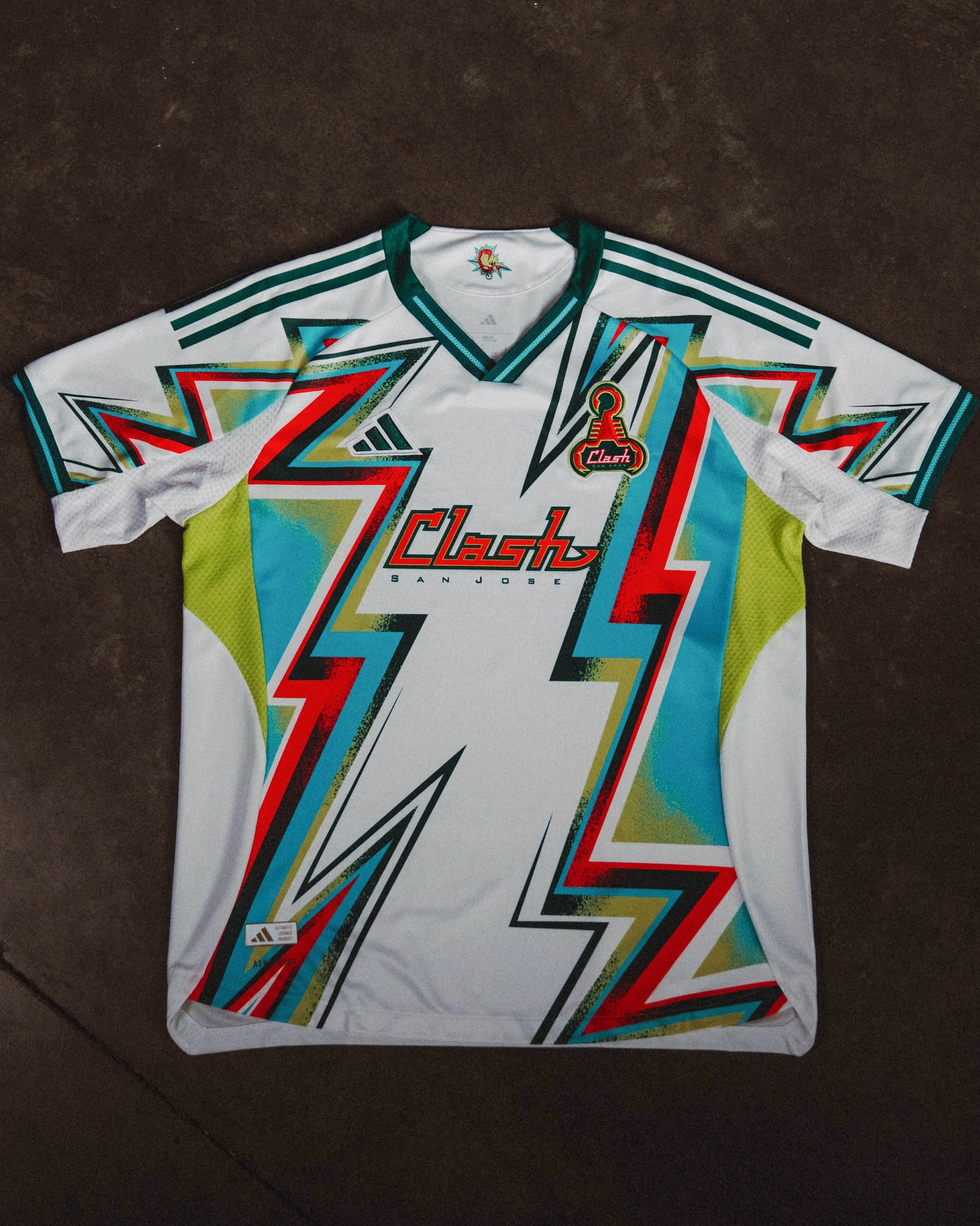 This San Jose kit pays tribute to the club’s original identity as the San Jose Clash. The shirt features a white base overlaid with vivid lightning bolt graphics in red, teal, yellow and black, drawing directly from the inaugural Clash look.