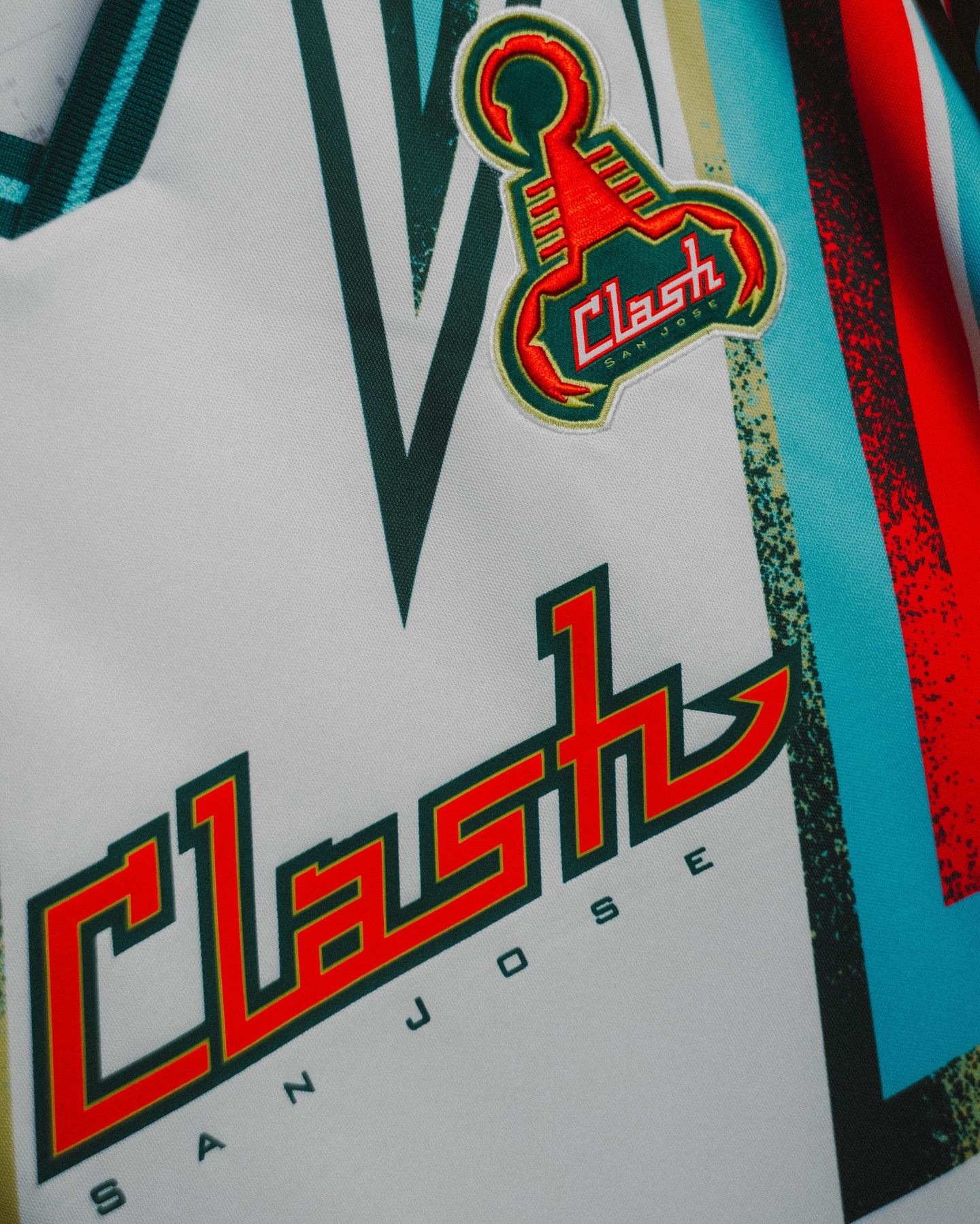 A throwback Clash crest sits on the left chest, with a stylised "Clash San Jose" wordmark central on the torso, while the collar and sleeve cuffs are finished in green with matching trim details. A licensed product label and the retro-style inner neck graphic complete the retro revival.