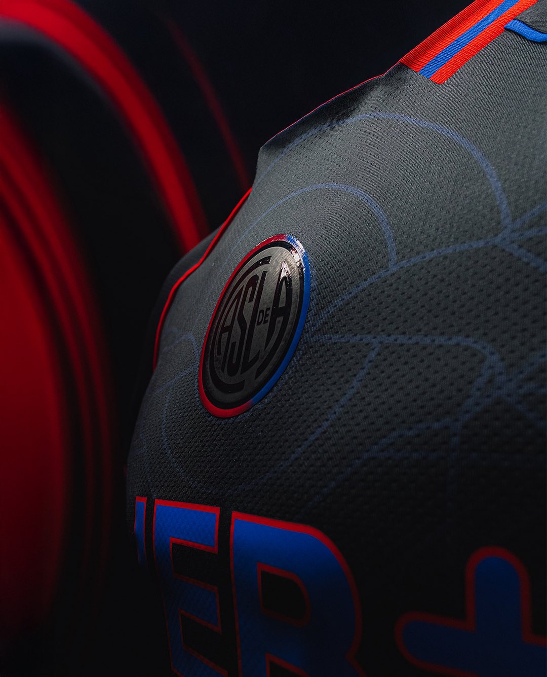 The back is kept largely plain, ensuring space for player names and numbers, which are styled in blue with red outlines. The kit will be worn with matching black shorts and socks, completing the third choice outfit for San Lorenzo’s 25/26 campaign.
