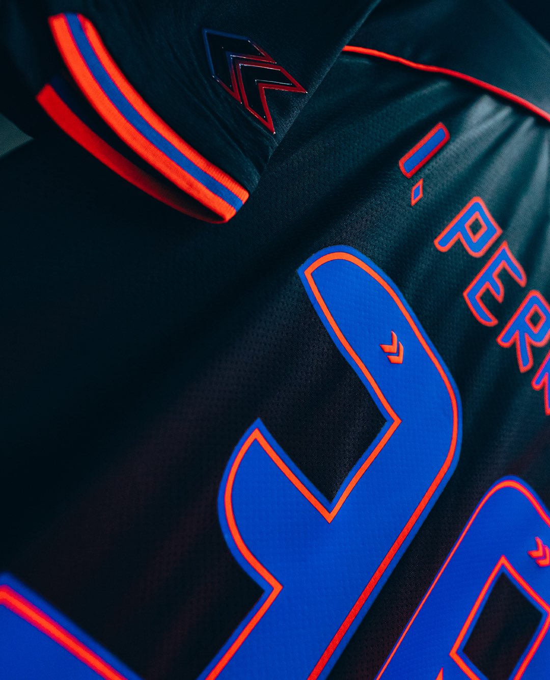 The Atomik shirt is black with a tonal geometric pattern running across the front, giving the base a textured effect. Bright red and blue details are introduced on the collar and sleeve cuffs, adding contrast to the darker body. The collar features a rounded cut with woven striping in the club’s traditional colours.