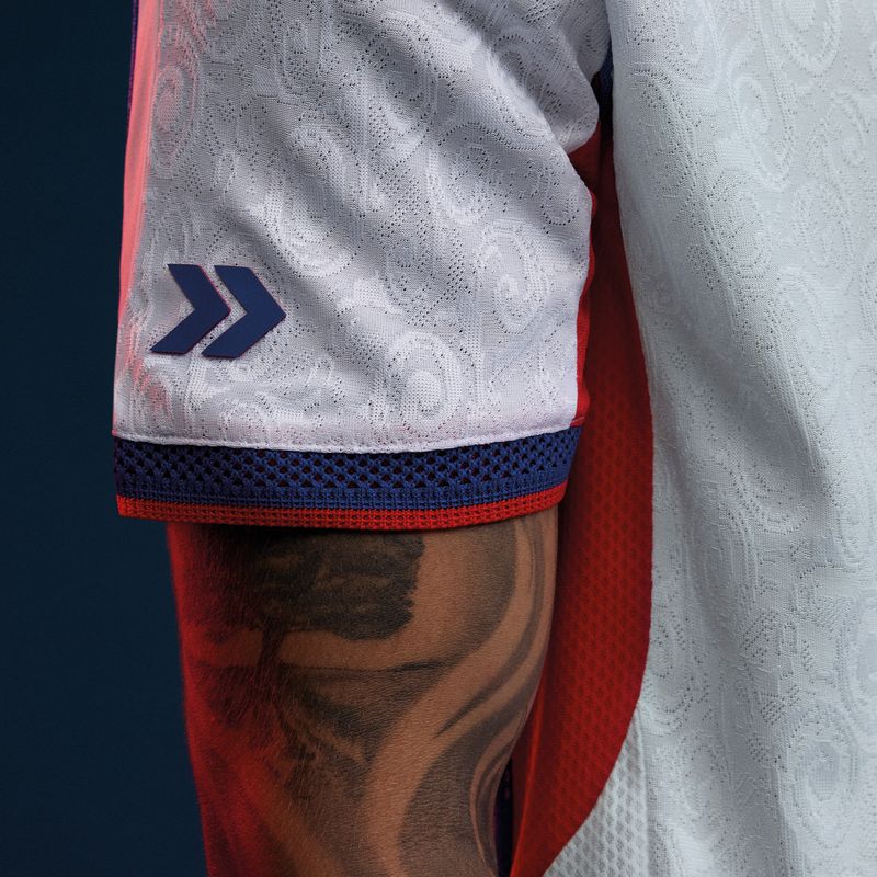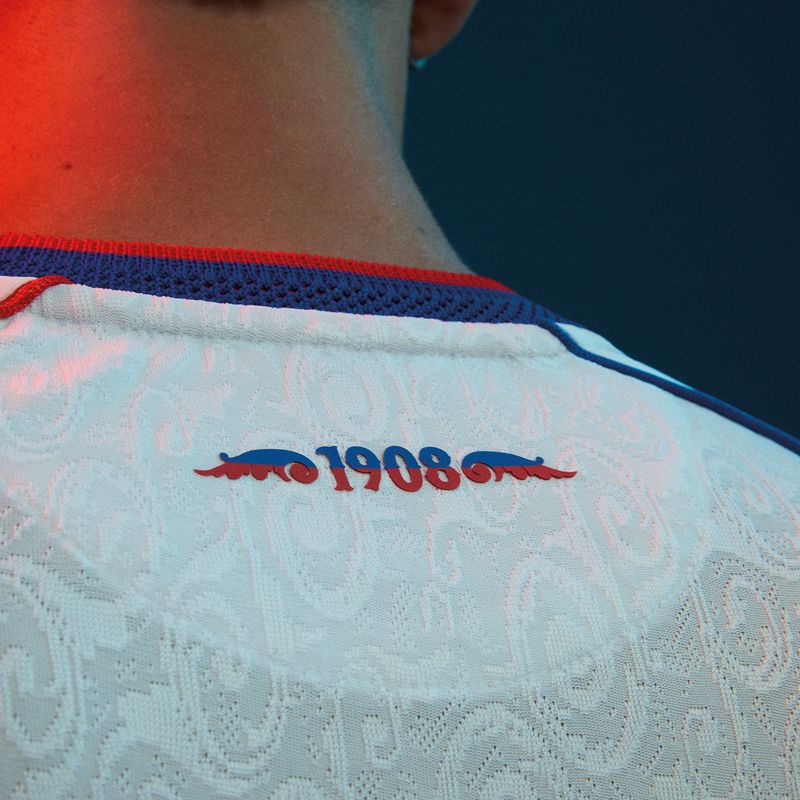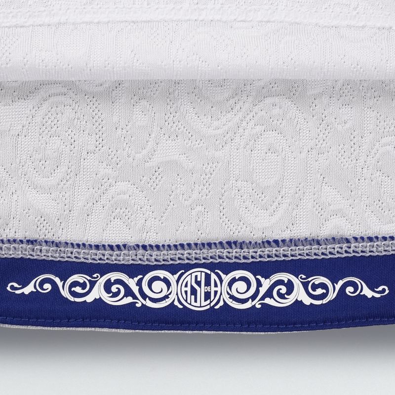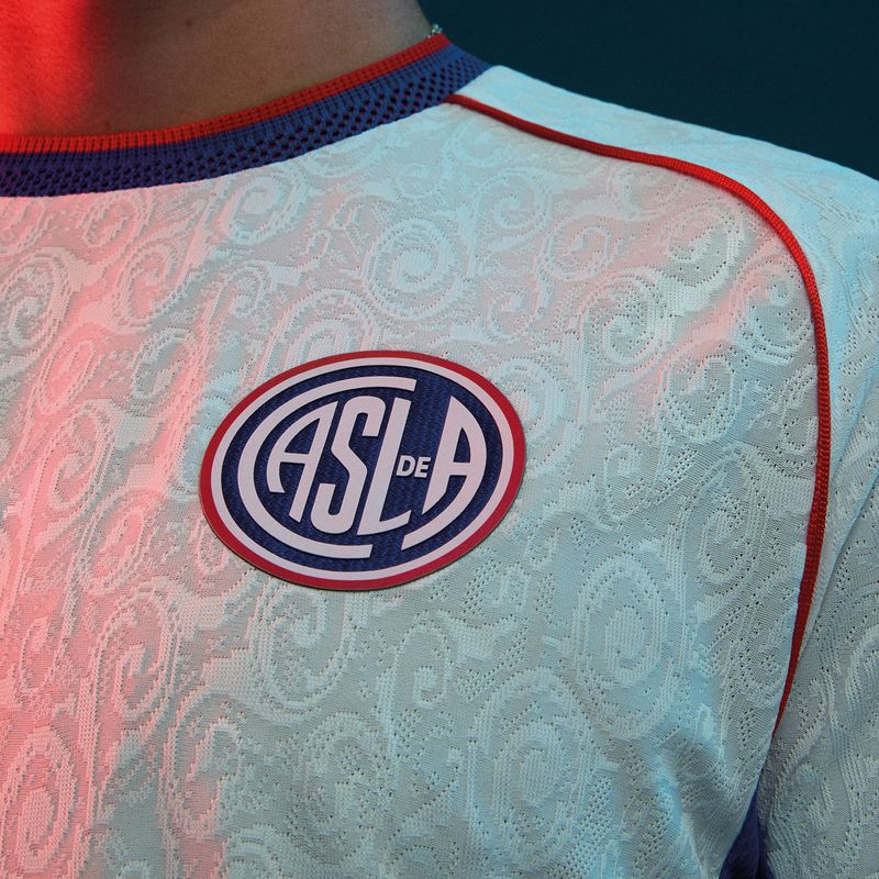The new San Lorenzo jersey arrives in white and incorporates a tonal jacquard pattern across the fabric. The textured design features ornamental lettering inspired by the visual culture of the Boedo neighbourhood, the historic district closely linked to the club. The pattern runs across the entire shirt and is visible through the lightweight woven construction.