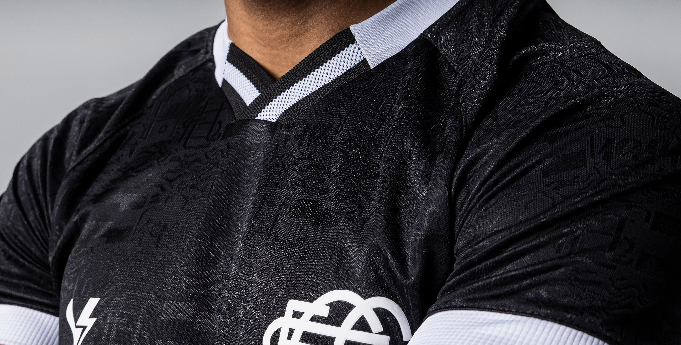 The new secondary change shirt from Volt is in black with an intricate jacquard design which spreads from the front of the trunk to the raglan sleeves.