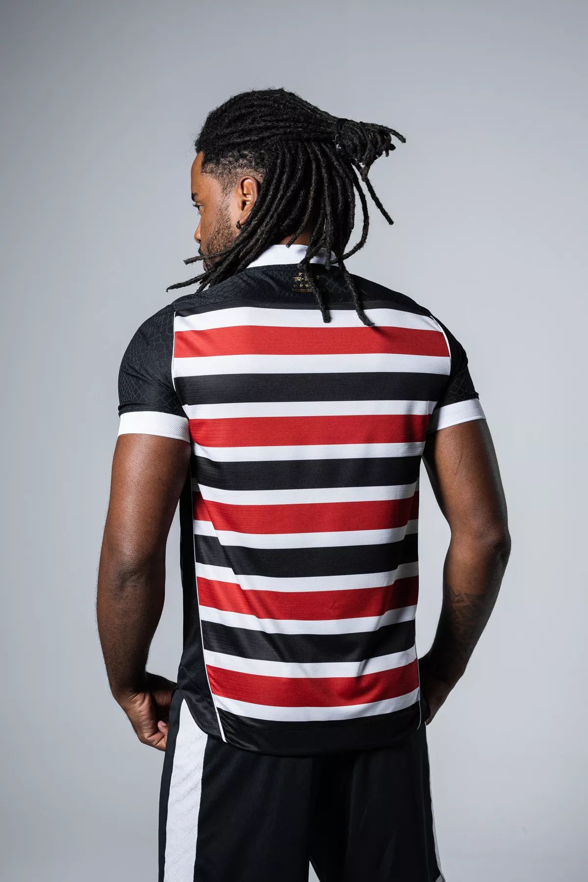 The Brazilian side’s primary release for 2023 is in the standard tri-colour (or “Tricolor”) palette of red, white and black - deployed in horizontal striping - the crest is in full colour and there is detailing in gold.