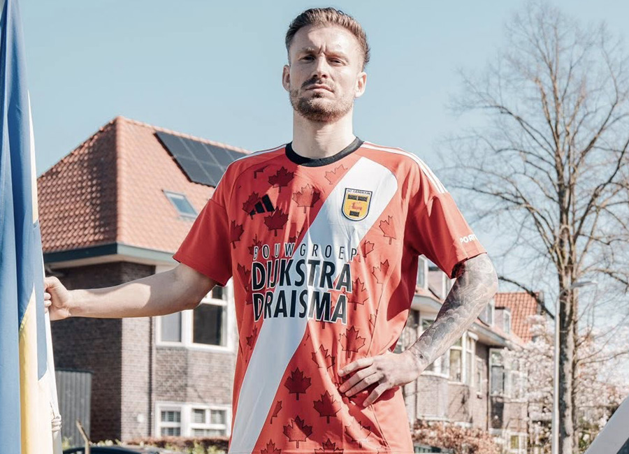The limited-edition shirt is designed by adidas and pays tribute to the regiment that helped liberate the city. Inspired by the Dragoons’ uniform, the red and white design features a diagonal sash effect with a pattern of red maple leaves across the front and sleeves. The regiment's emblem is placed below the collar on the upper back.
