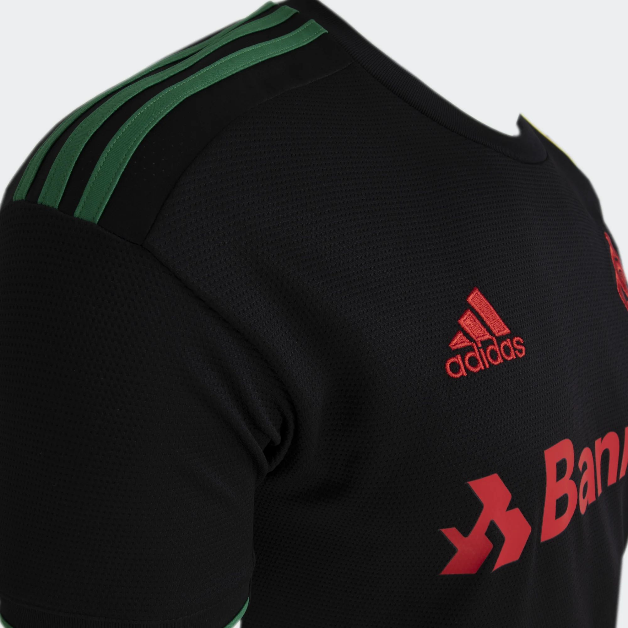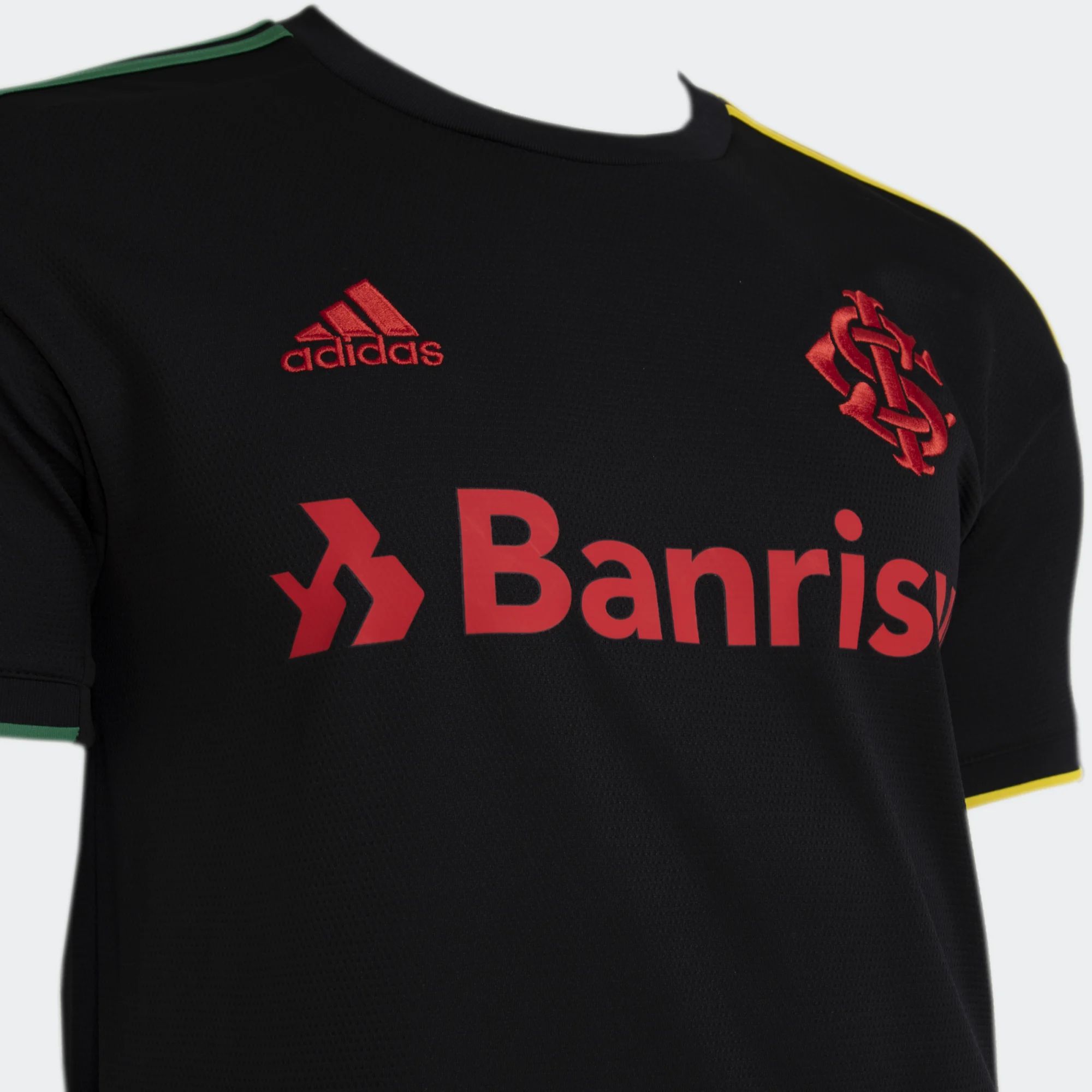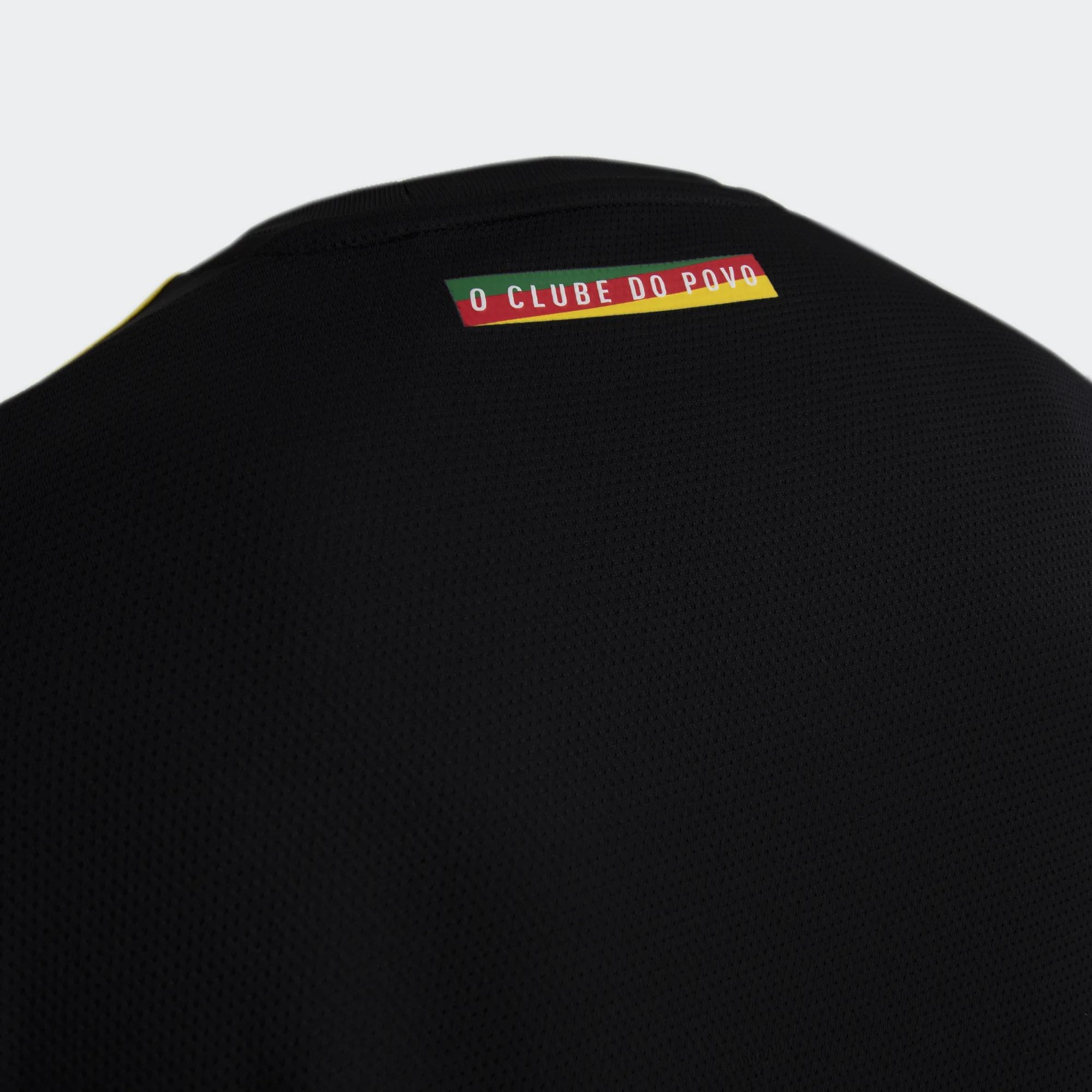 The 2022-23 alternate-change release for the Brazilian side is in black with green (the German manufacturer’s stripes on the right shoulder and the trim on the right sleeve), red (the crest, the adidas chest logo and the other partner printing) and yellow (the left shoulder’s striping and its trim).