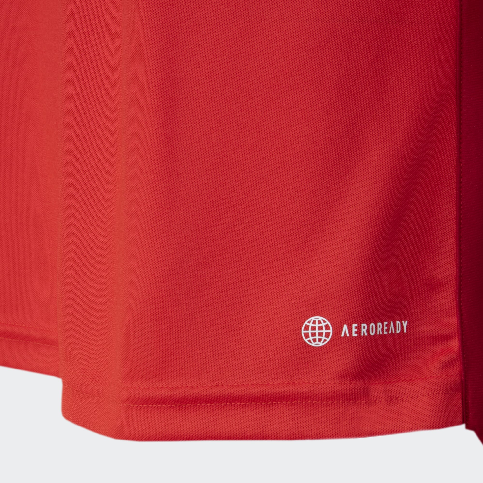 The V-neck collar, cuffs, and three stripes on the shoulders feature a darker shade of red, while the crest, main sponsor, and adidas logo stand out in white for a striking contrast.