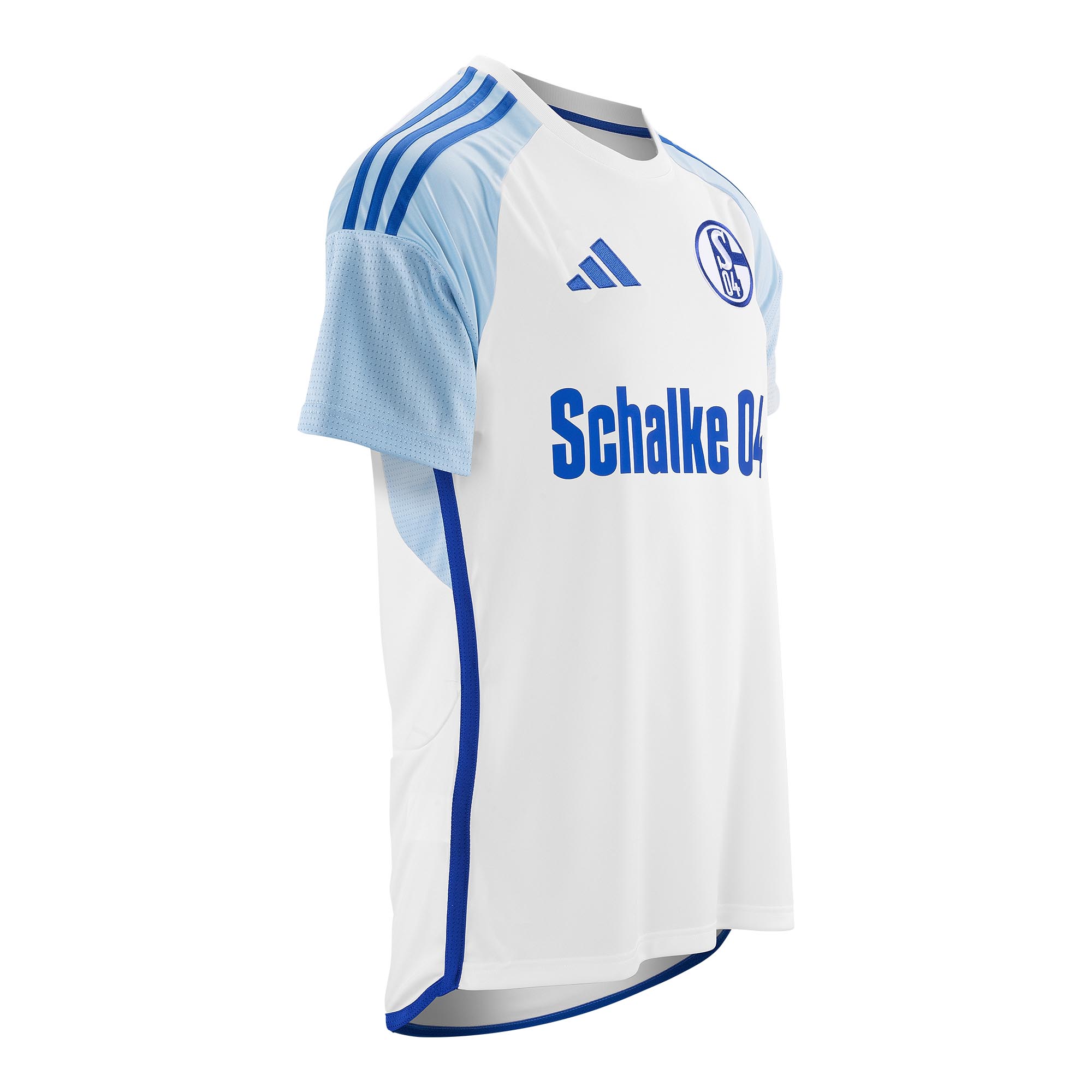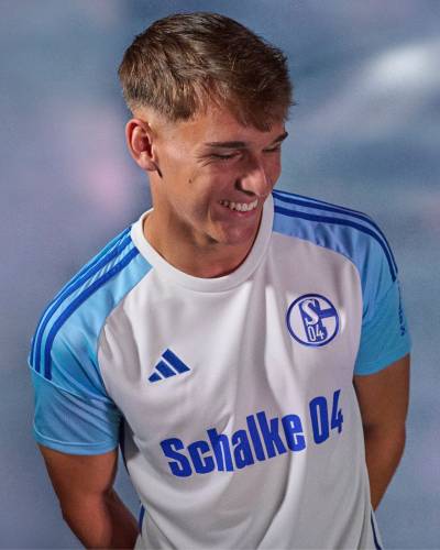 Playing in the 2. Bundesliga in 2023-24, Schalke 04 will have, to call upon, courtesy of 11teamsports, a white change design with sky-blue raglan sleeves, complete with royal-blue embellishments - including the team name in the central sponsorship position. The kit is completed with sky-blue shorts and socks.