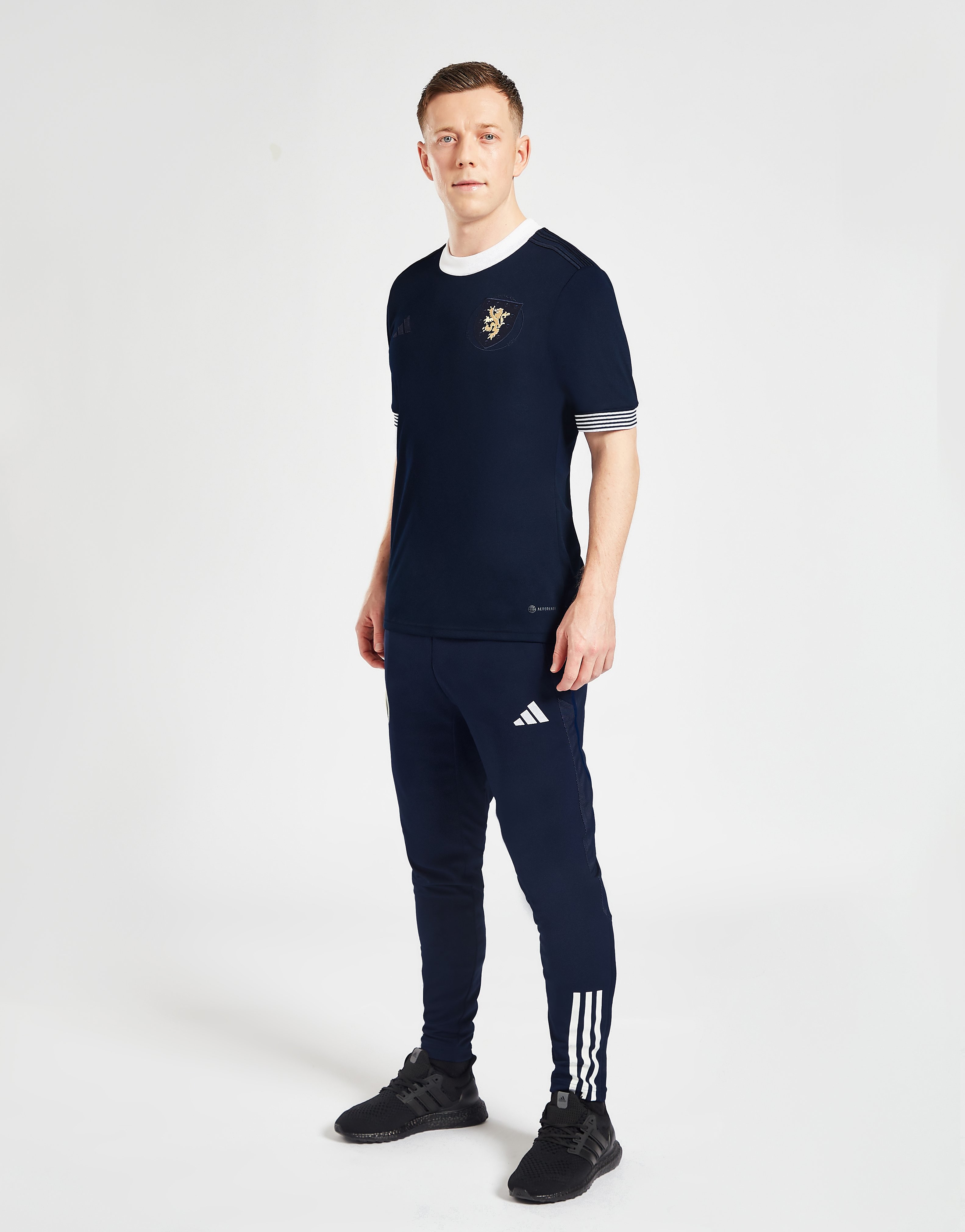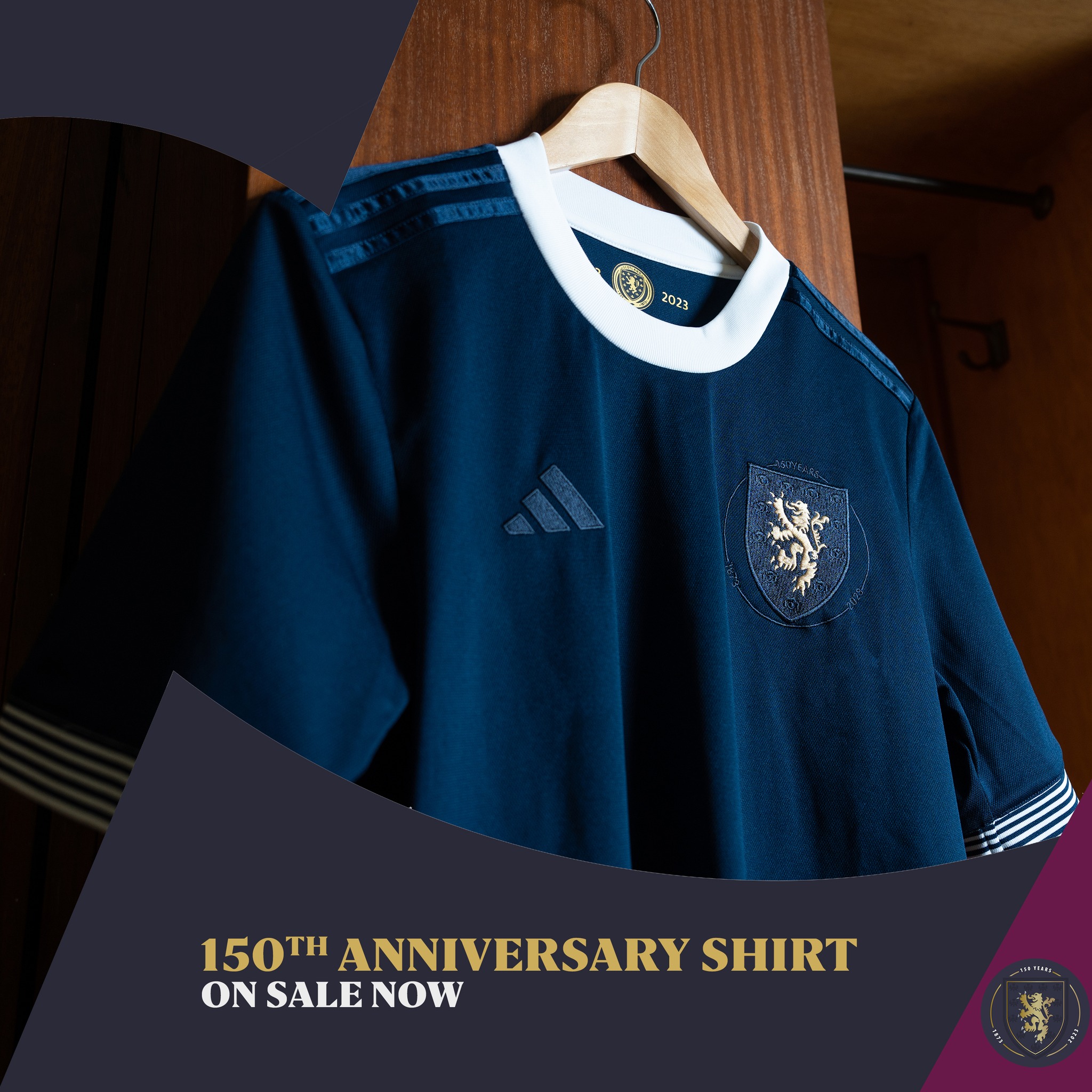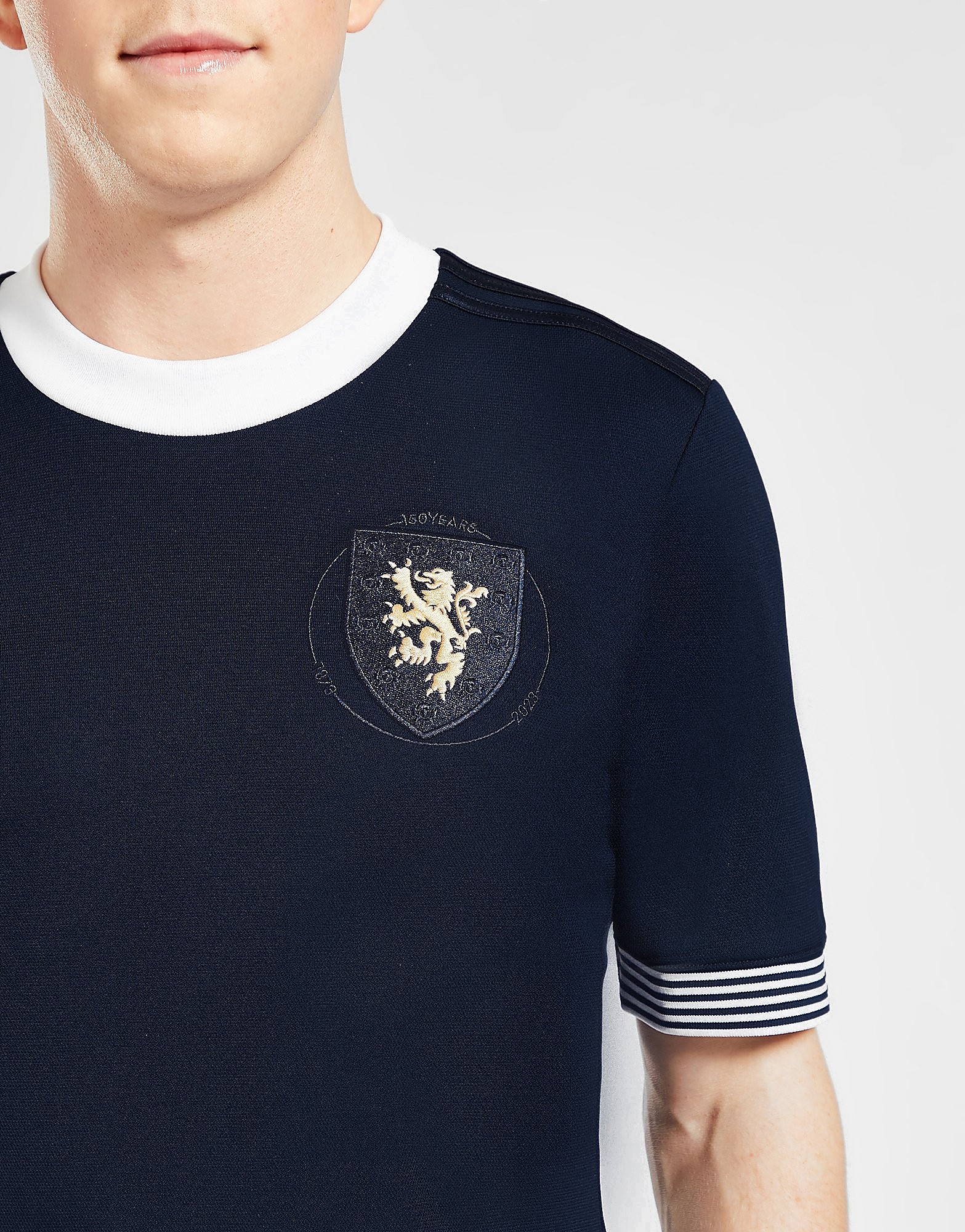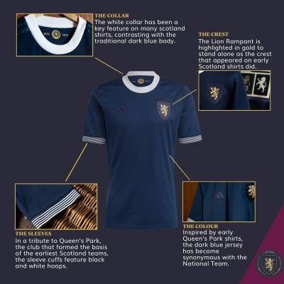 The adidas branding is navy-on-navy, as is the crest, allowing it to be enlarged and the only contrast element being the golden lion rampant, while the neck is white, the cuffs are black-and-white hooped - honouring Queen’s Park, whose teams powered the representative selection circa the SFA’s 1873 beginnings - and the retro-inspired 2023 release has a detail around the aforementioned crest noting the landmark birthday.