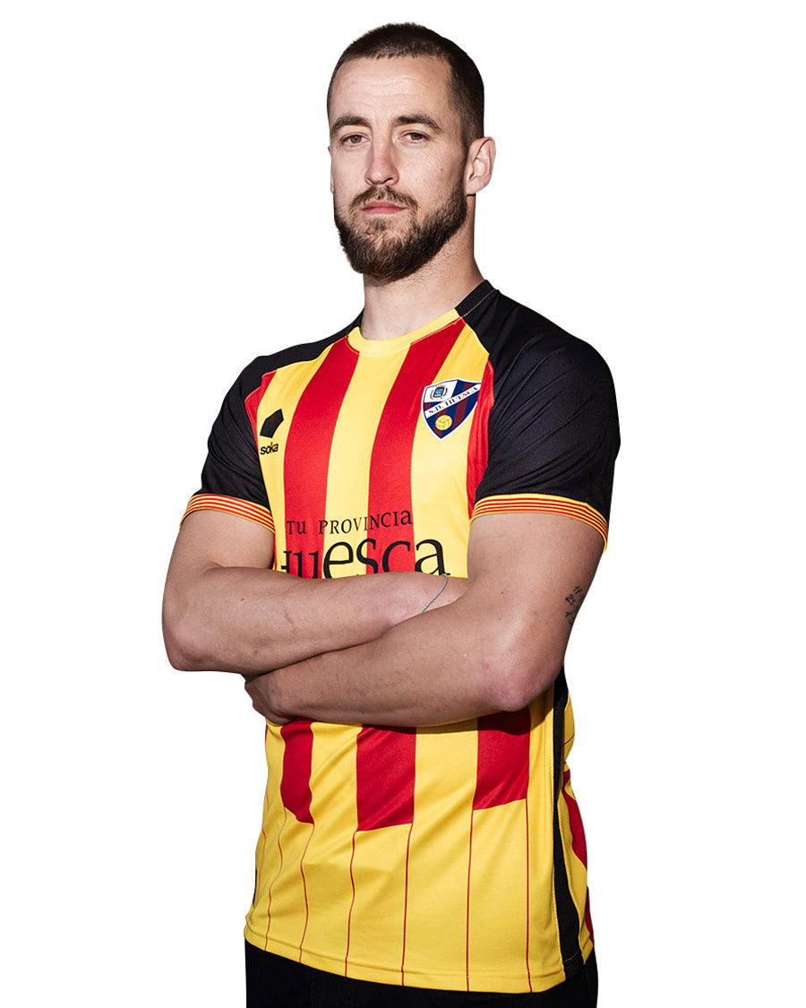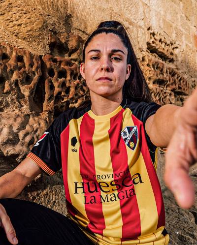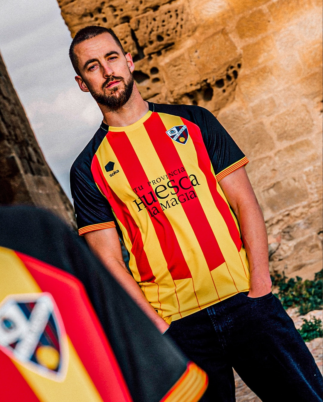 Designed and produced in Aragón in collaboration with Soka, the shirt features vertical red and yellow stripes inspired by the regional flag, paired with black sleeves. The cuffs include a distinctive multi-coloured band in red and yellow, adding another nod to the flag of Aragón.