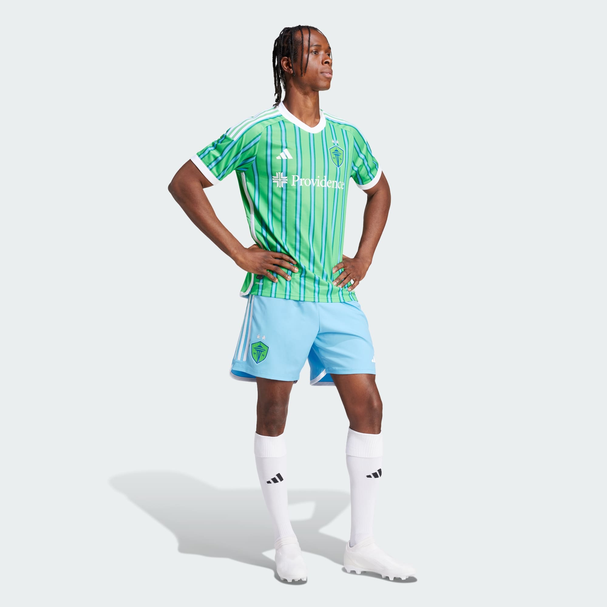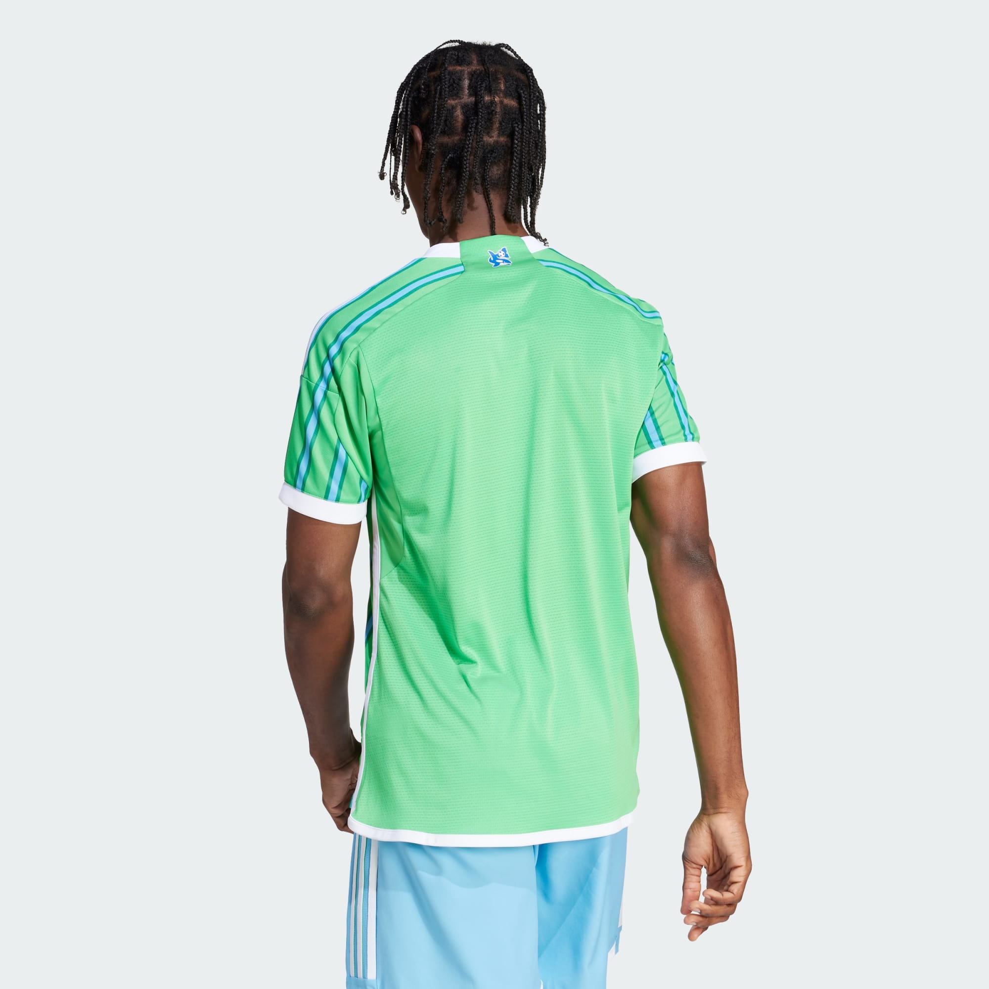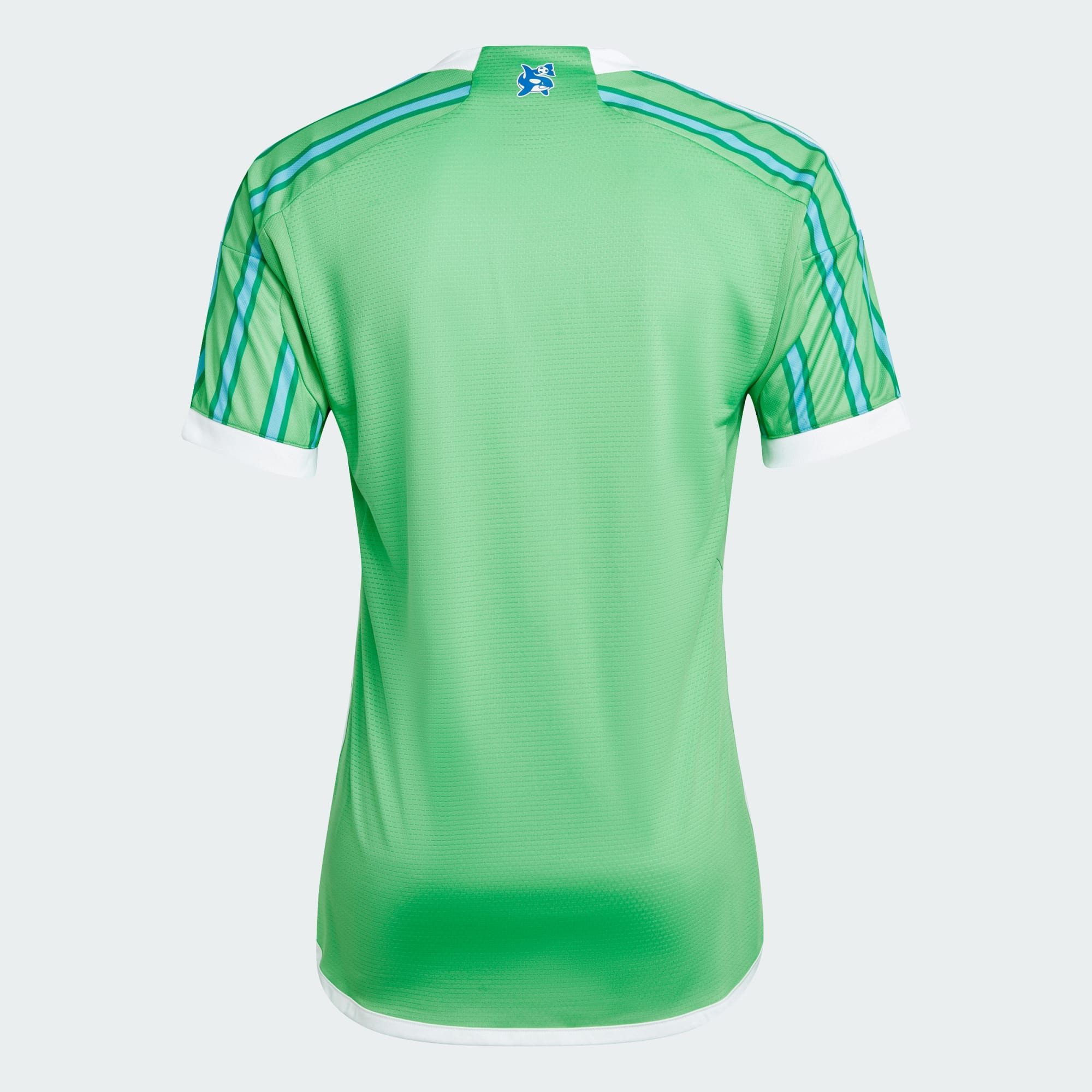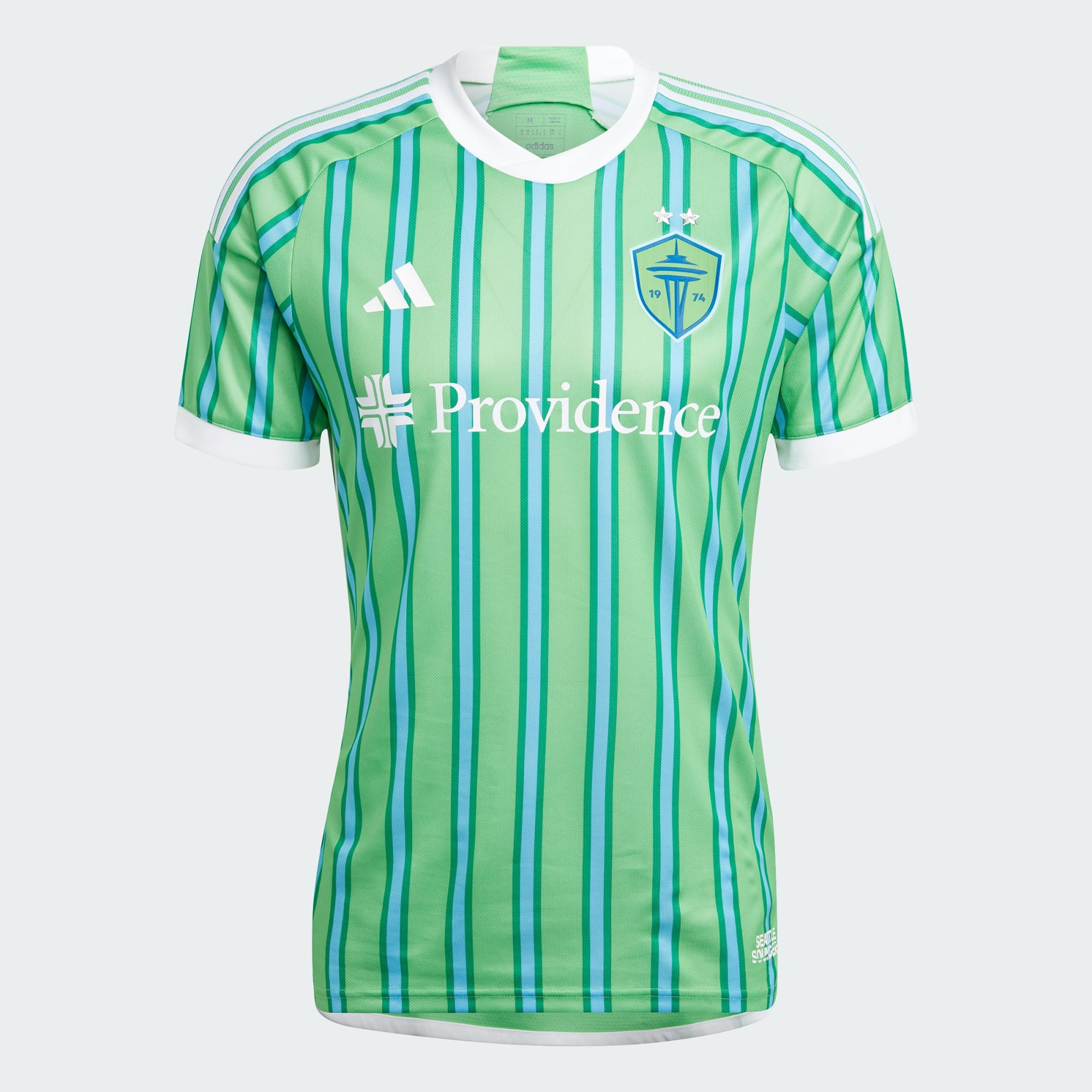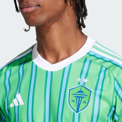 The kit is distinguished by its base colour of the newly introduced Rave Green, complemented by Heritage Aqua striping, a nod to the club's original colours from 1974. This update in the club's colour scheme was part of Sounders FC's brand evolution last autumn, transitioning from classic Rave Green and Pacific Blue to include Heritage Aqua, reflecting the club's original hues.